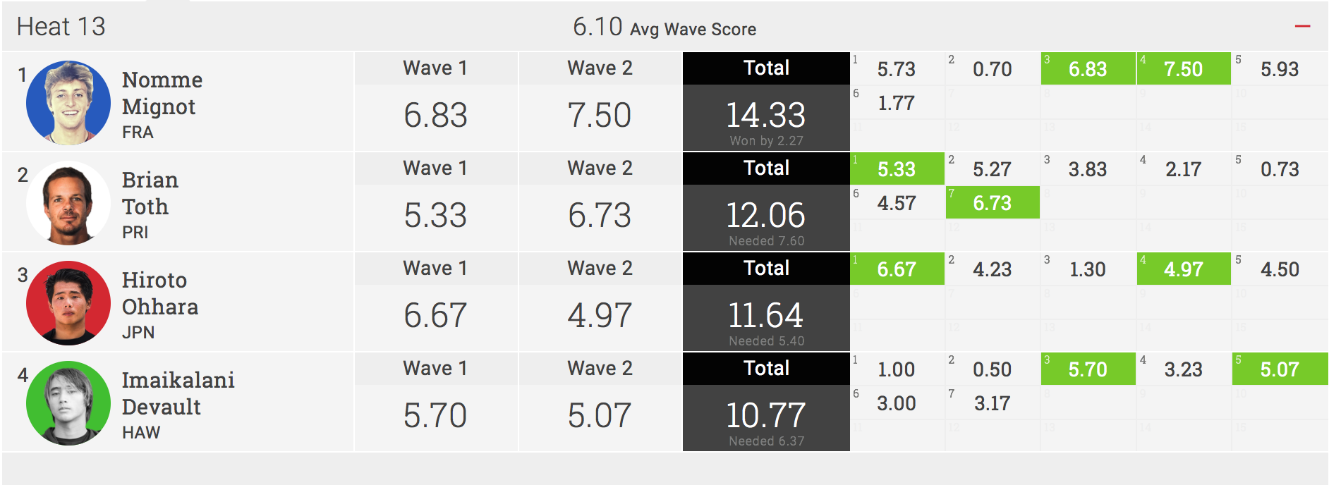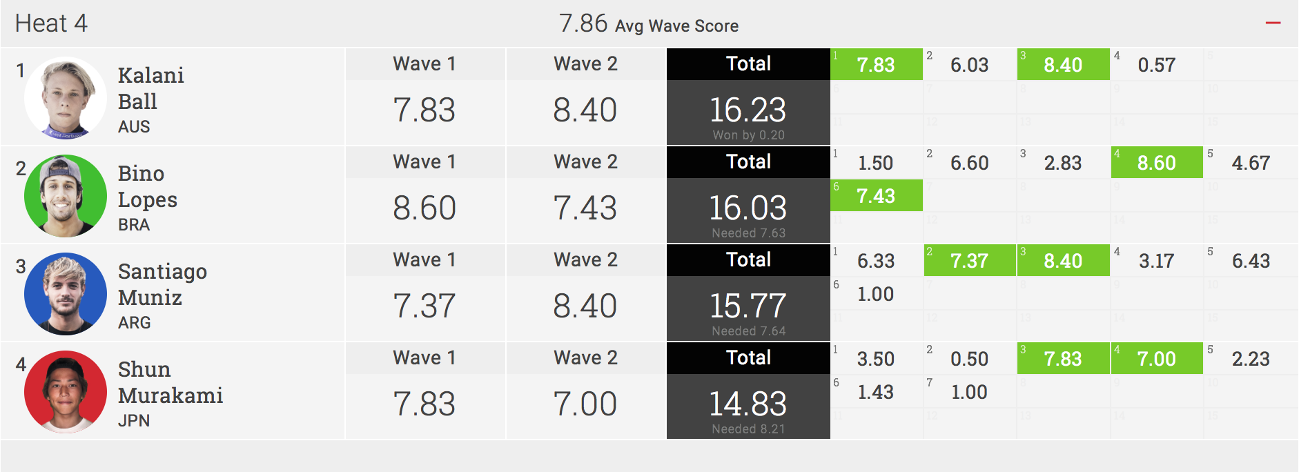 日本時間の4/3(月)夜からスタートとなったコンテストDAY2は、ラウンド3のヒート9からラウンド4の全ヒートを消化された中、日本の若きサムライたちは健闘虚しく惜しくもこの日に全員が敗退となってしまった。