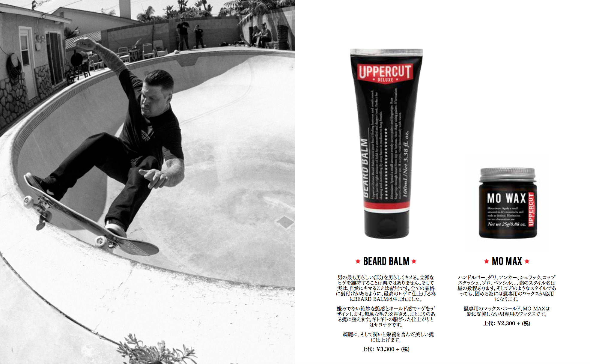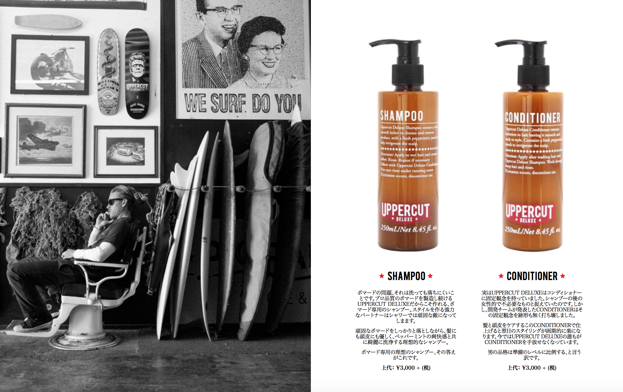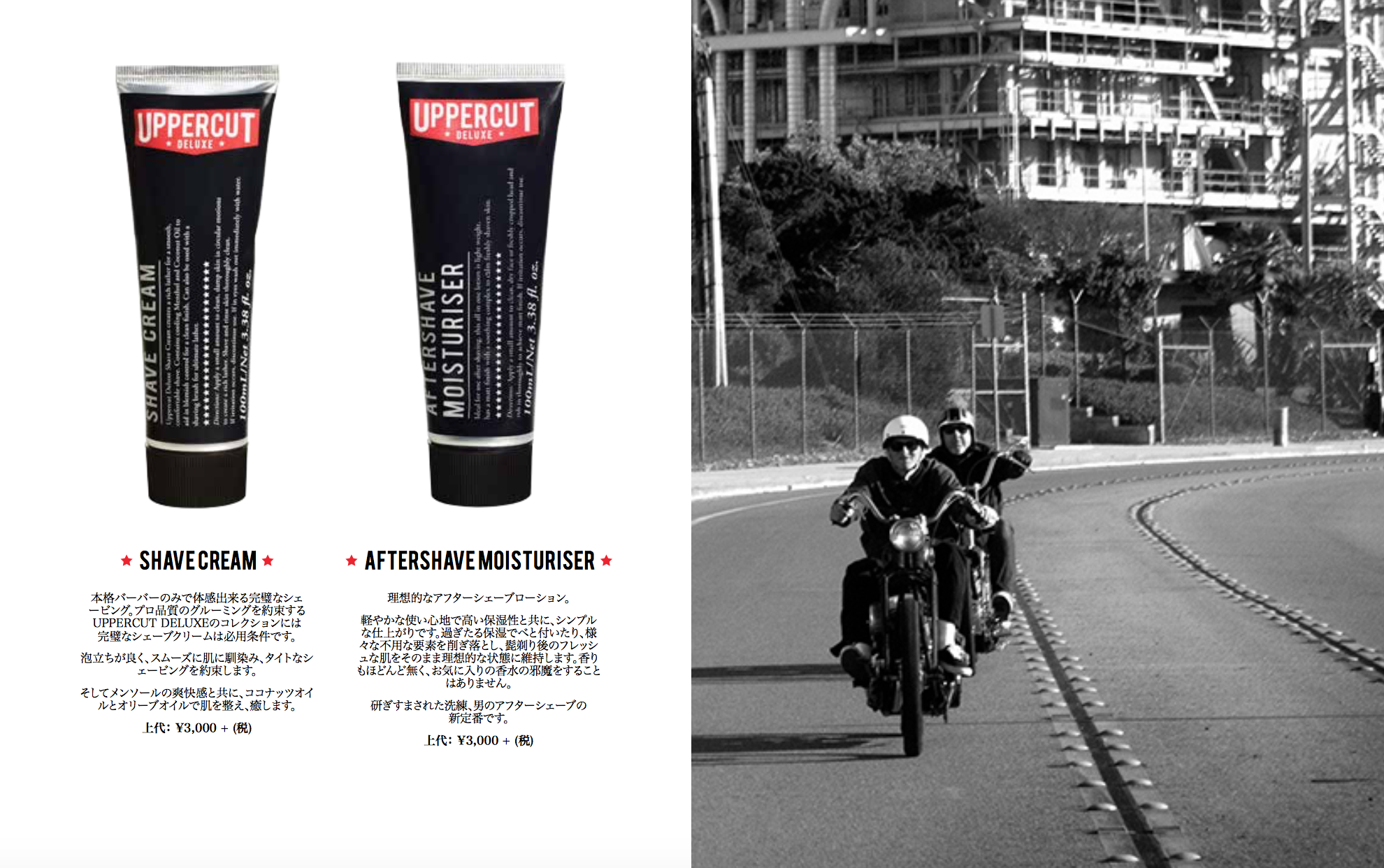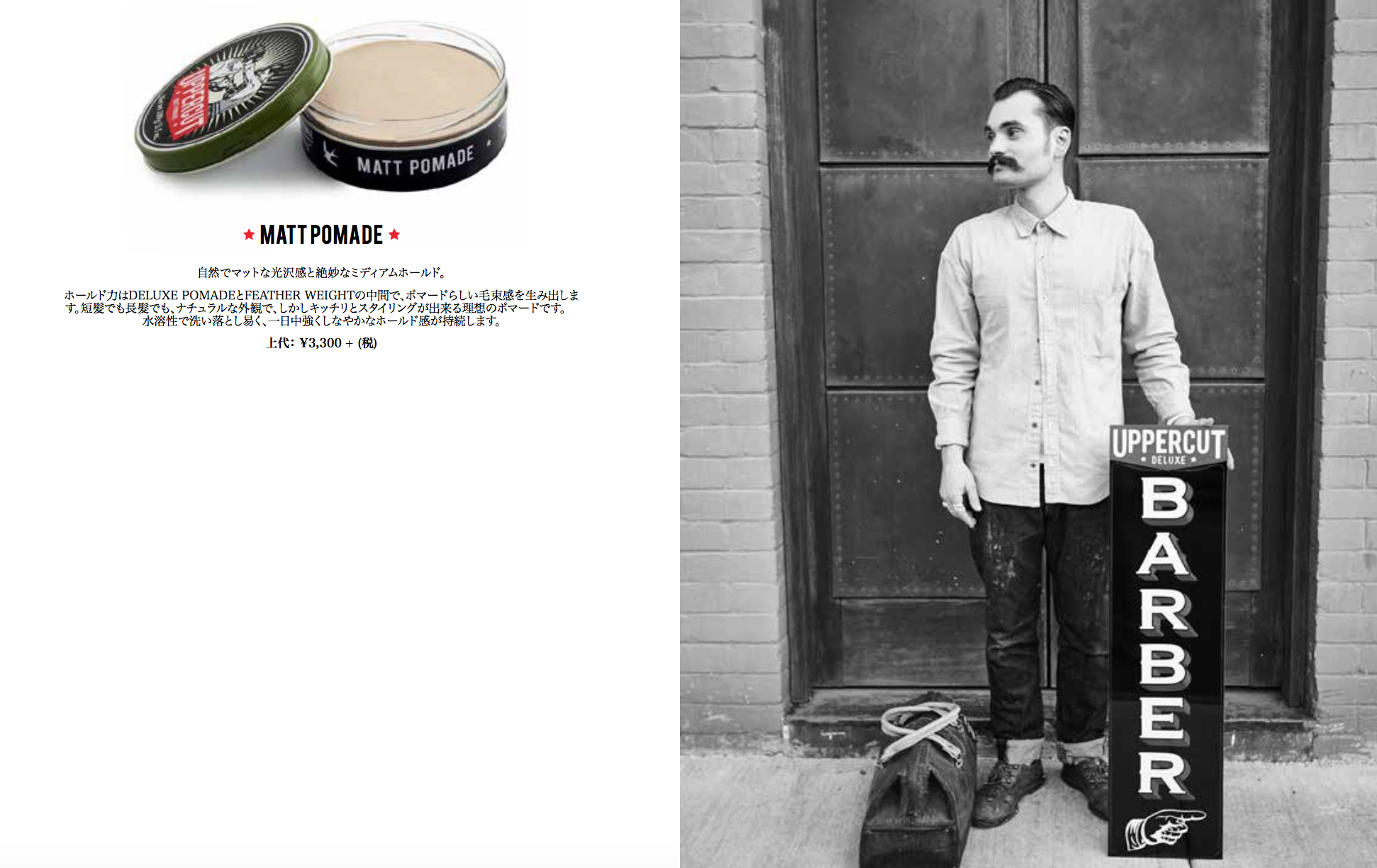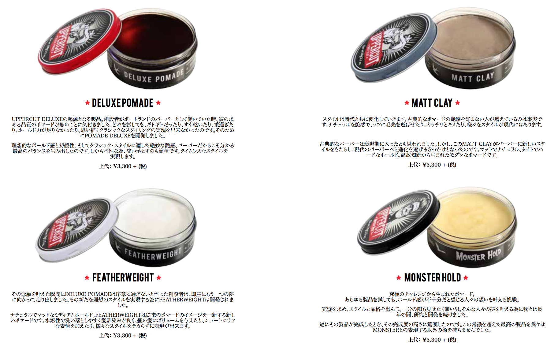 さらにコーム、シャンプー、コンディショナーの他スキンクリームやシェービングクリームなどのメンズコスメがラインナップ。使用感抜群のポマード『UPPER CUT』ぜひ使ってみていただきたい。病みつきになる!こと間違いなし」