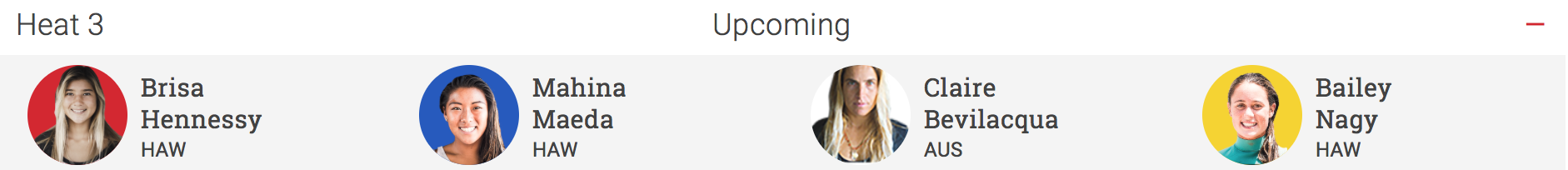 迎えるWOMENSラウンド4のヒート3ではBrisa Hennessy(HAW)、Claire Bevilacque(AUS)、Bailey Nagy(HAW)と対戦予定となっている。