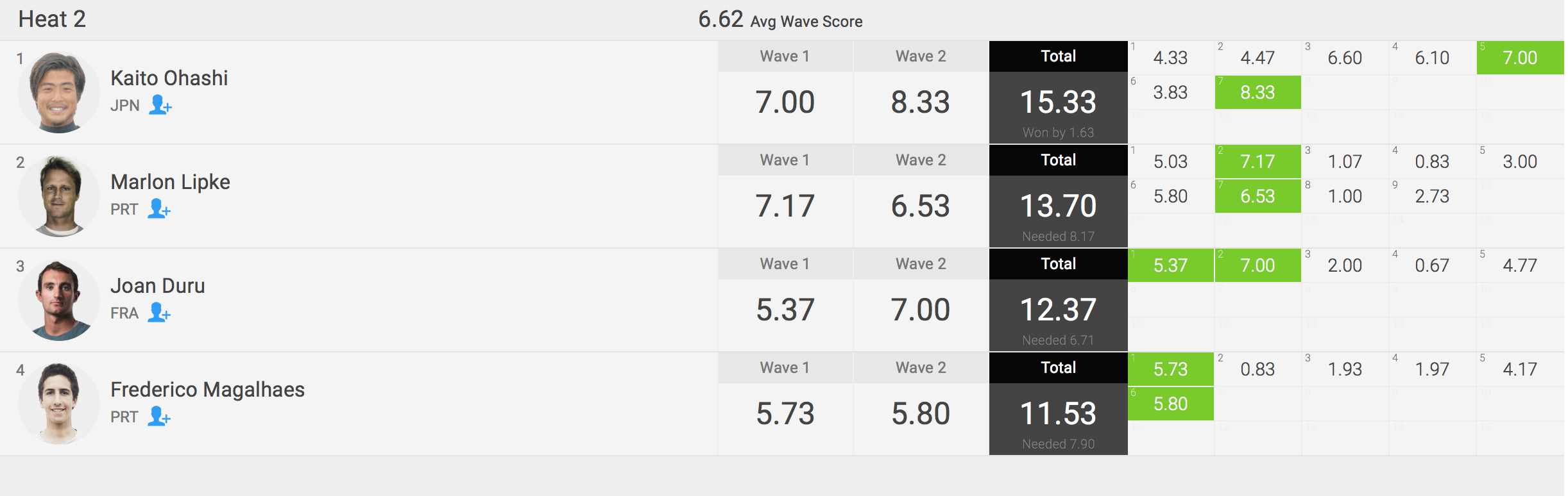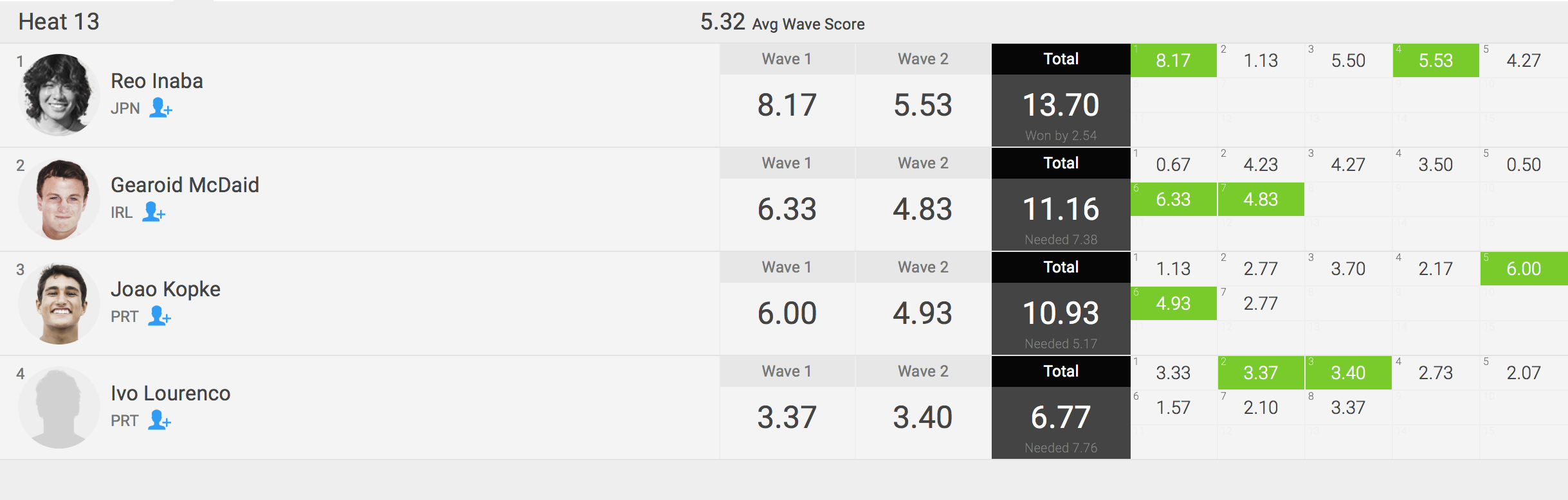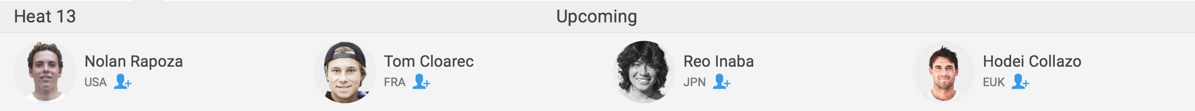 迎えるラウンド2のヒートでは13ではNolan Rapoza(USA)、Tom Cloarec(FRA)、Hosei Collazo(EUK)と対戦予定となっている。