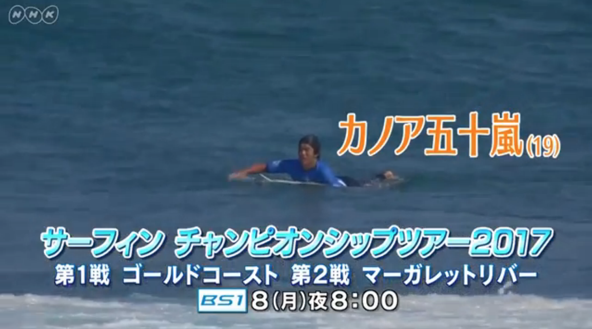 5/8(月)20:00から21:50まで、BS1にて、カノア五十嵐のCT第1戦と第2戦を追った番組”サーフィン・チャンピオンシップツアー2017”いよいよ放送!!
