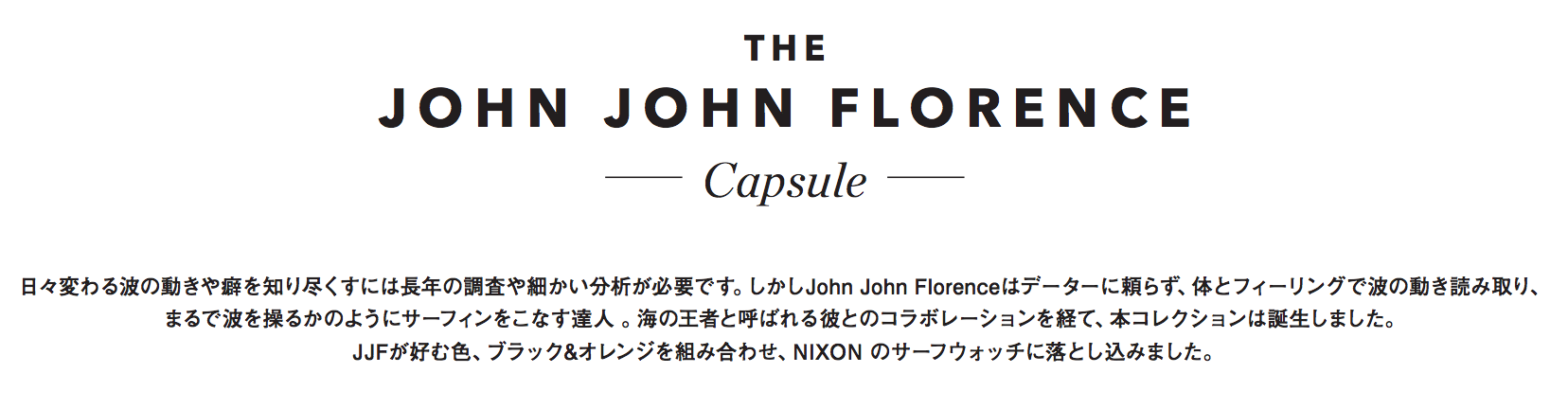2016年ワールドチャンプであり、今を輝く世界的サーフスターでもあるJohn John Florenceの好むブラックとオレンジを基調とした”John John Florence Capsule Collection”がNIXONよりリリースされた。