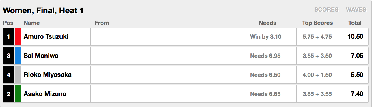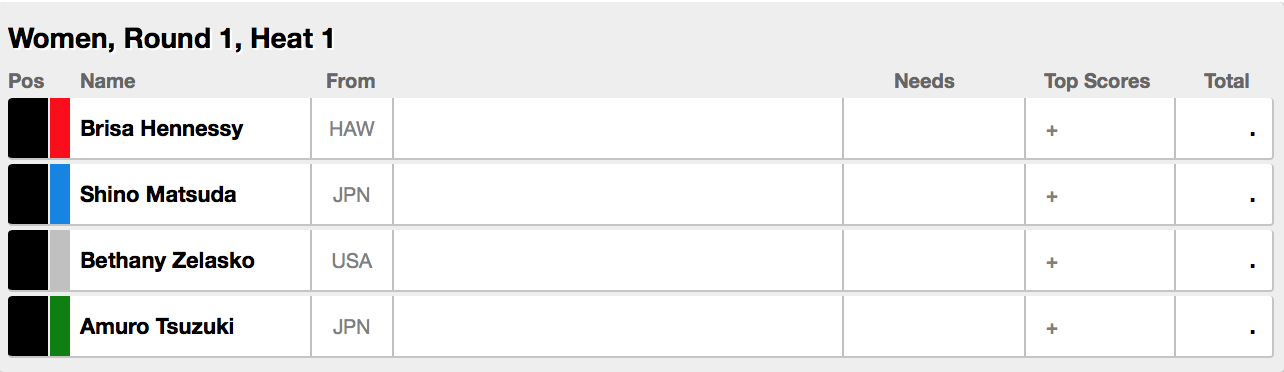 WOMENS優勝の都筑有夢路はラウンド1のヒート1でBrisa Hennessy(HAW)、松田詩野(JPN)、Bethany Zelasko(USA)と対戦予定。
