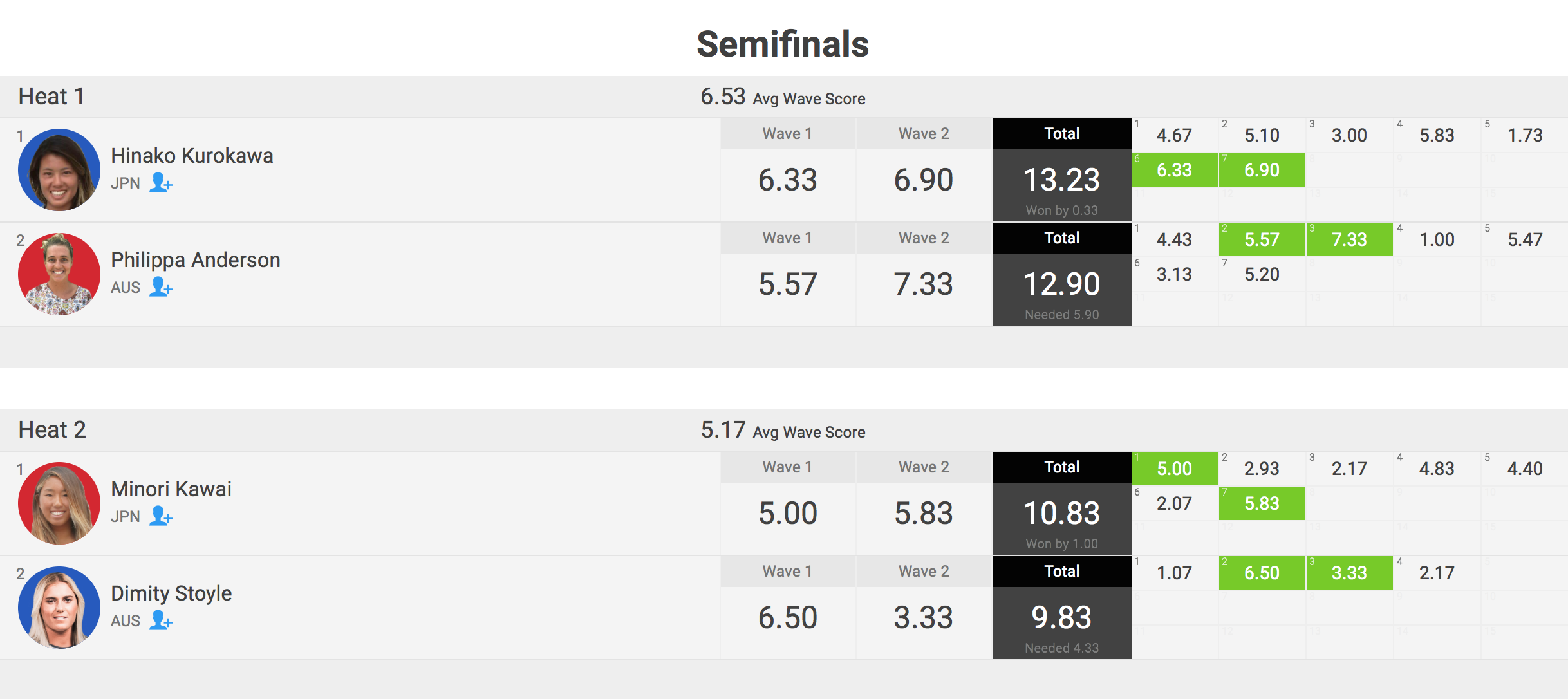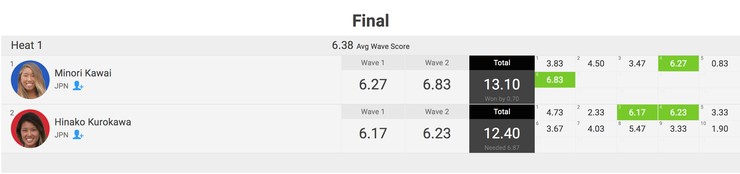 注目のWOMENS QS3000では、セミファイナルのヒート1でPhilippa Anderson(AUS)を下した黒川日菜子と、セミファイナルのヒート2でDimity Stoyle(AUS)に逆転勝利した川合美乃里といった日本人選手同士の戦いとなり、手に汗握る試合展開の中、弱冠16歳の川合美乃里が見事優勝を飾った!!
