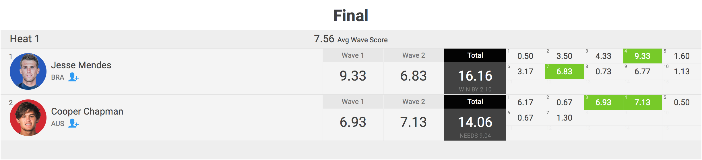 一方のMENSファイナルはJesse Mendes(AUS)とCooper Chapman(AUS)の一騎打ちとなり、3本目の波で9.33ptを叩き出したJesse Mendesが見事優勝!!