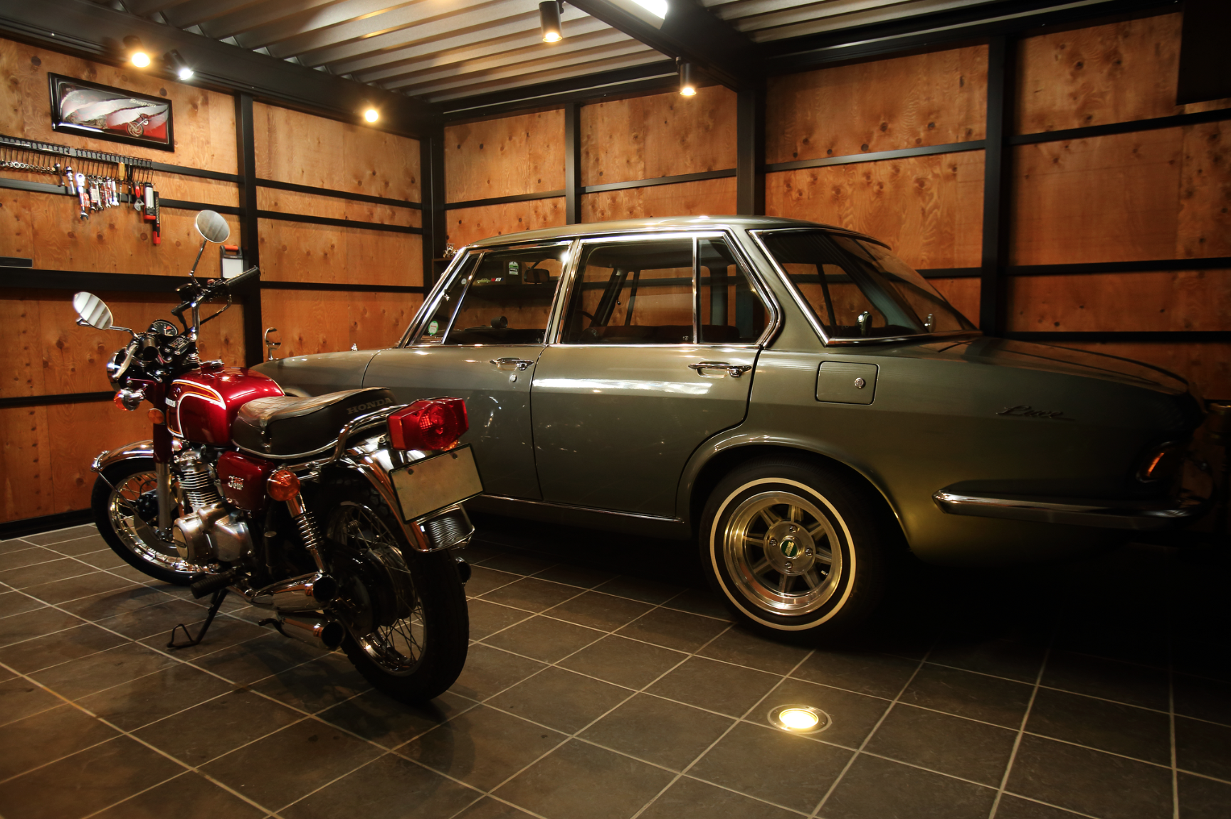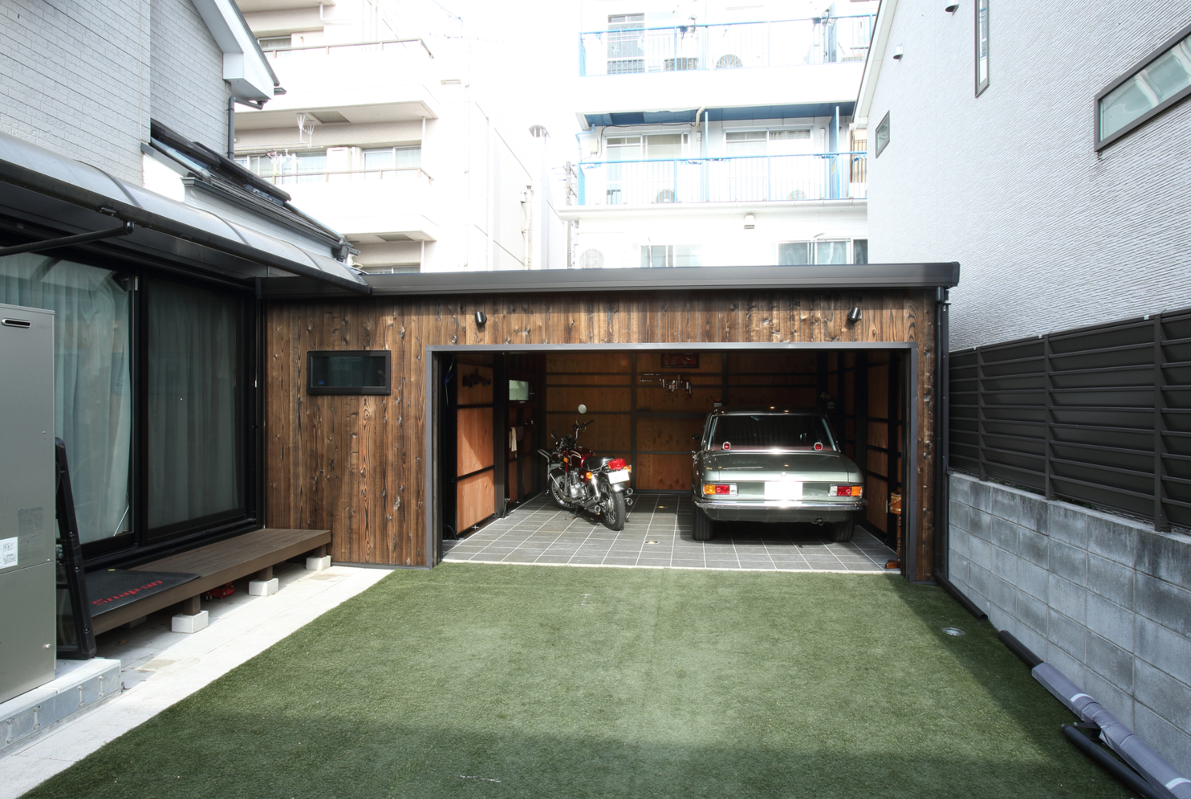 というご要望に応えるべく、間口、奥行、高さ全てのサイズ制限をクリアし、極限まで有効スペースを確保することで初めて形となったガレージにはY様の愛する旧車の数々が保管されていた。
