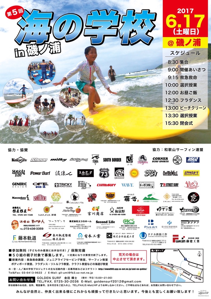 堀口真平プロが校長、金田輝士プロが責任者をつとめるこの海の学校 in 磯ノ浦では、救急救命講習、サーフィン・ボディーボード、ジュニアライフセービング、フラダンス、リトルフラ、クラフト、海遊びなど海に携わる色々なことを無料で学び、体験することが可能。
