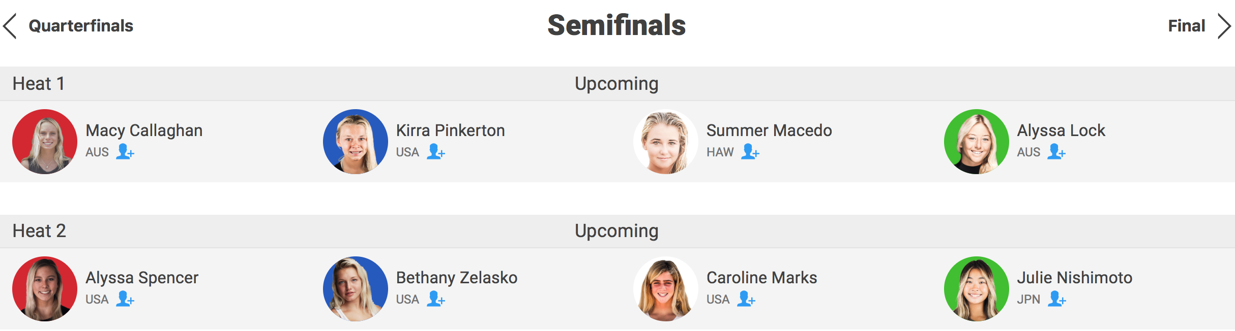 迎えるセミファイナルのヒート2ではAlussa Spencer(USA)、Bethany Zelasko(USA)、Caroline Marks(USA)と対戦予定。