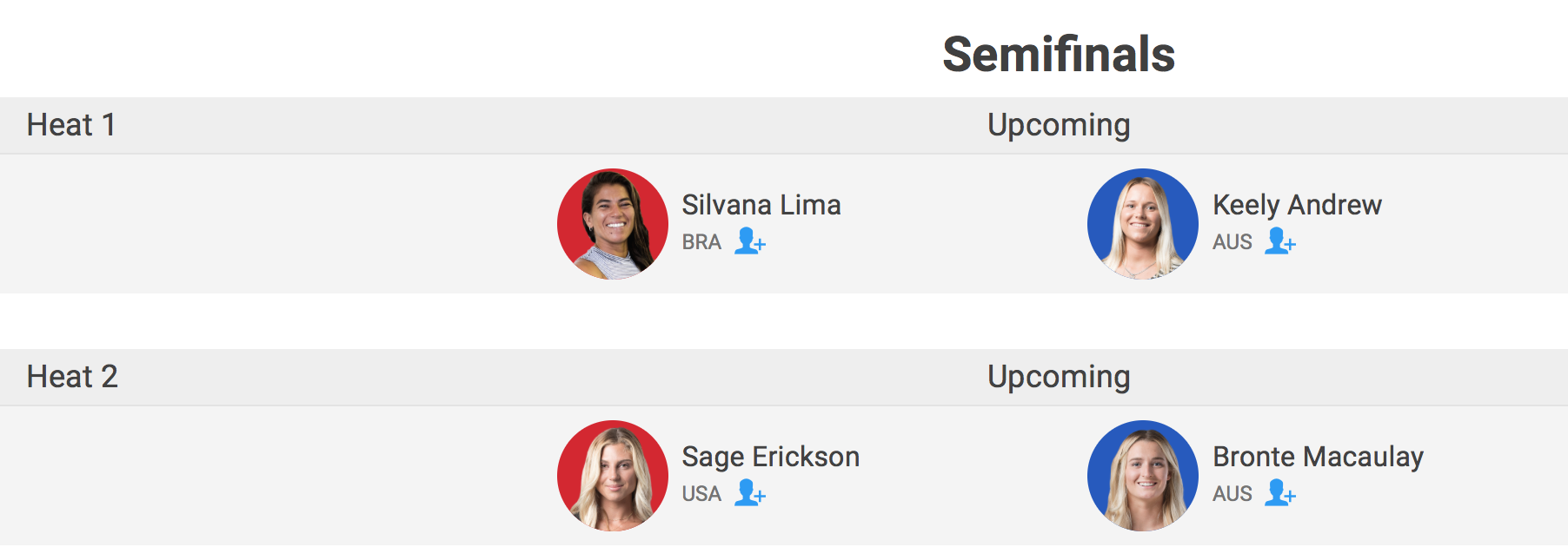 メインイベントとなるWOMENS QS6000は残すところセミファイナルからという状況となっており、Silvana Lima(BRA)、Keely Andrew(AUS)がヒート1で、Sage Erickson(USA)、Bronte Macauley(AUS)がヒート2で対戦予定となっている。
