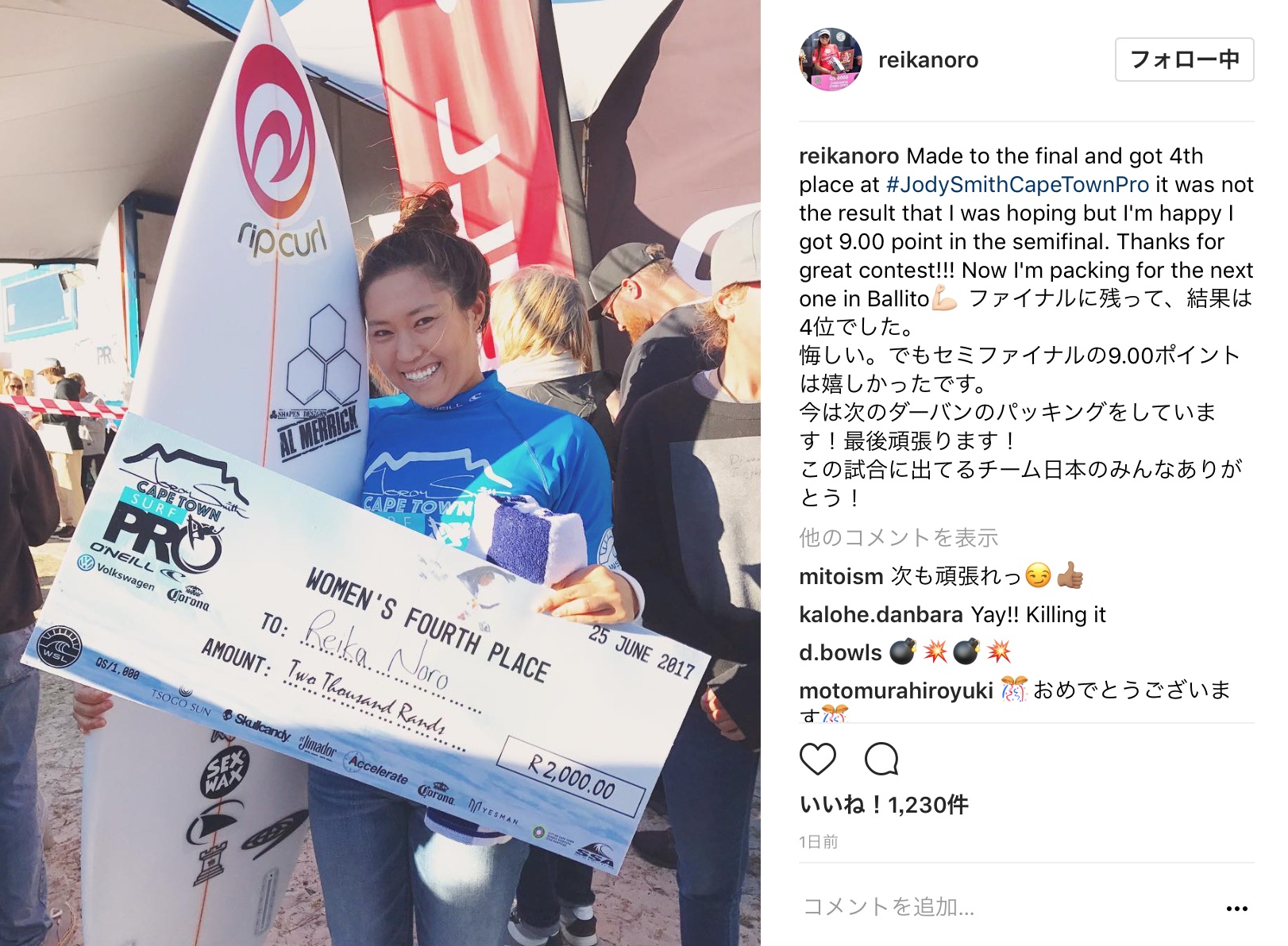 「Made to the final and got 4th place at #JodySmithCapeTownPro it was not the result that I was hoping but I’m happy I got 9.00 point in the semifinal. Thanks for great contest!!! Now I’m packing for the next one in Ballito💪🏻 ファイナルに残って、結果は4位でした。