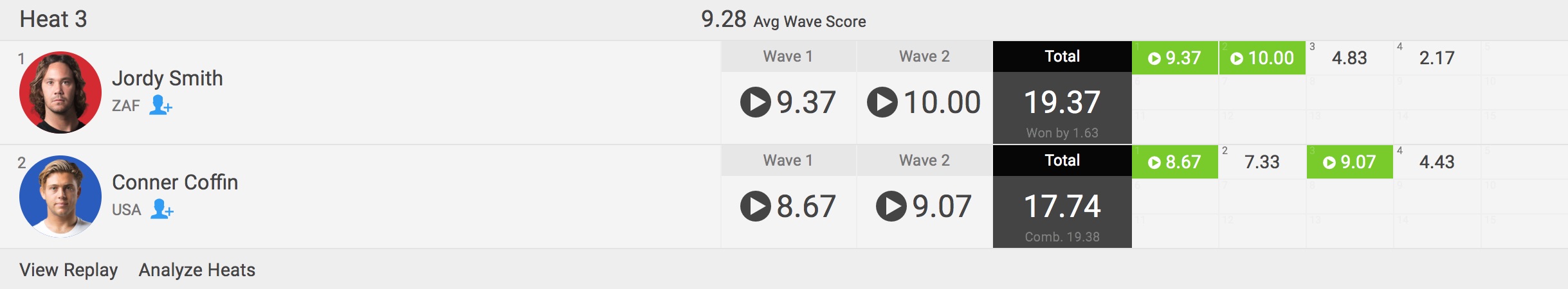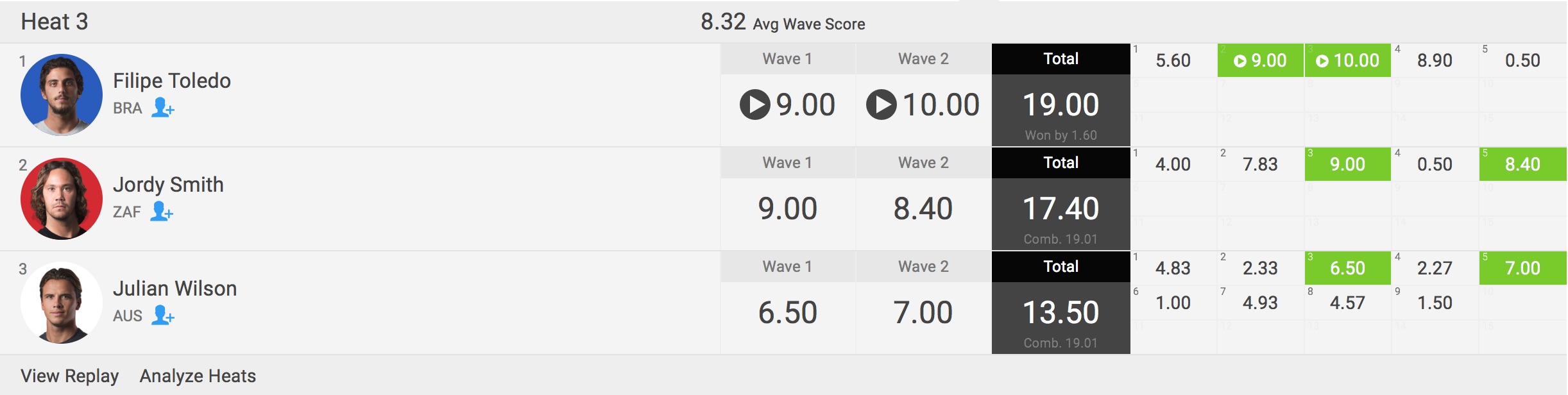 colorsmag的にはFilipe Toledoのフルローテーション・アーリーウープ2連発は12ptをあげたいのと、Jordy Smith、Frederico Moraisどちらの10ptもやばいと思いますが、完全にそれを超える10ptは、こちらのライディングで決まり!
