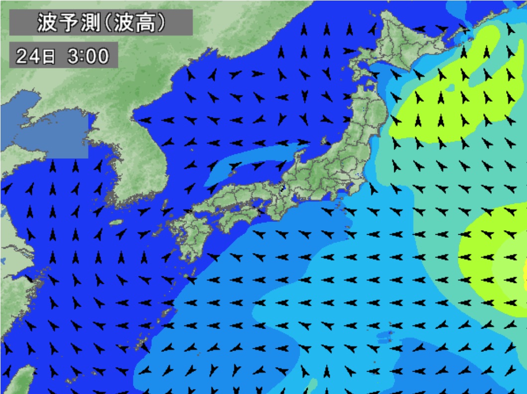 肝心のグランドスウェルは、22日の夜あたりより南東から東南東のうねりが徐々に千葉以北エリアに渡って届き始め、四国の真下あたりにある低気圧の影響で風はゆるい南西風がベースとなることが予想される。