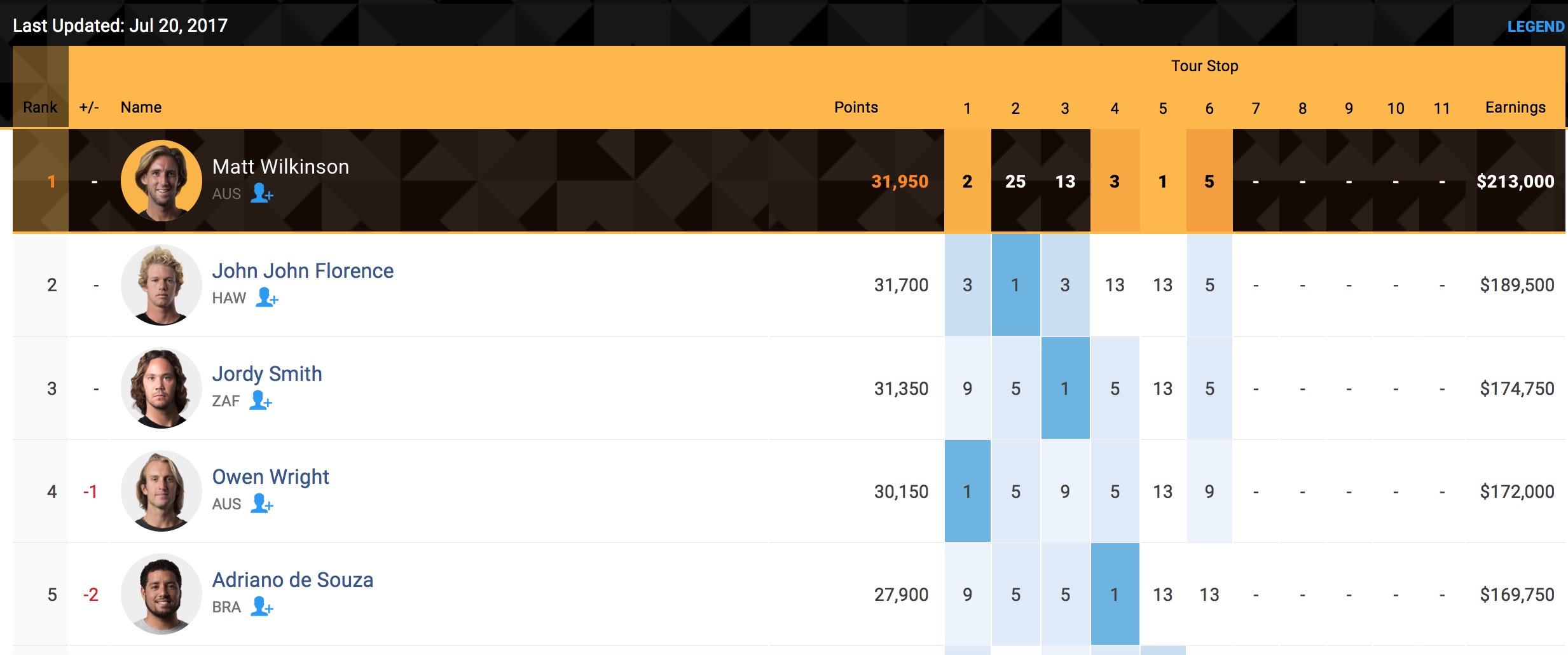 ランキングトップでワールドタイトルを狙うMatt Wilkinsonはクォーターファイナルで敗退となったもののそのままトップをキープし、2位にはJohn John Florence、3位にJordy Smith、4位にOwen Wright、5位のAdriano de Souzaがその後を僅差で追う。