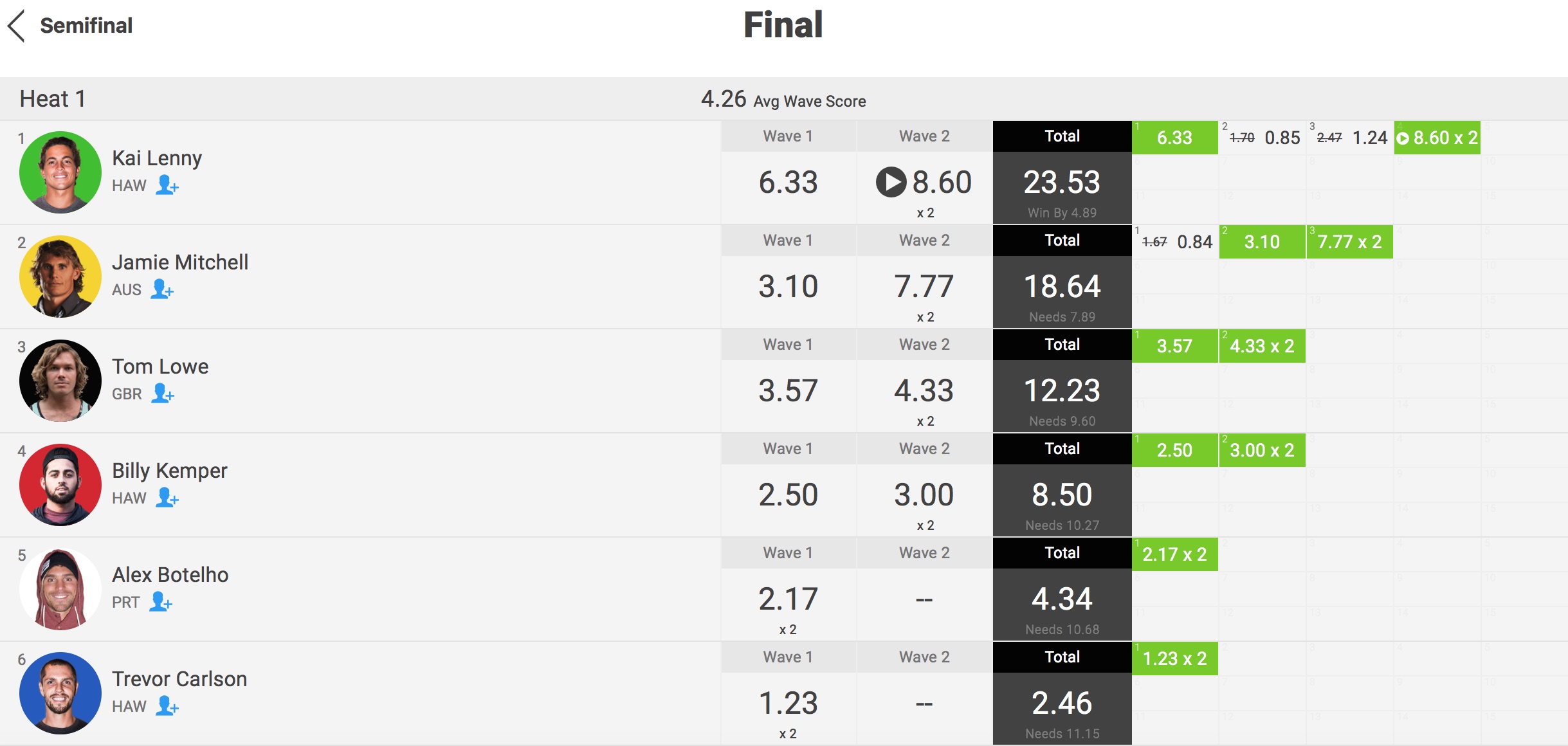 Kai Lennyにあと一歩及ばず、本人としては不本意な準優勝となったのは昨年、ポルトガルのナザレで行われたBWTでの優勝者であるJamie Mitchell、3位にTom Lowe、Pe’ahiことJAWSで行われたBWT優勝者のBilly Kemperが4位、Alex Botelhoが5位、Trevor Carlsonが6位という結果となった。