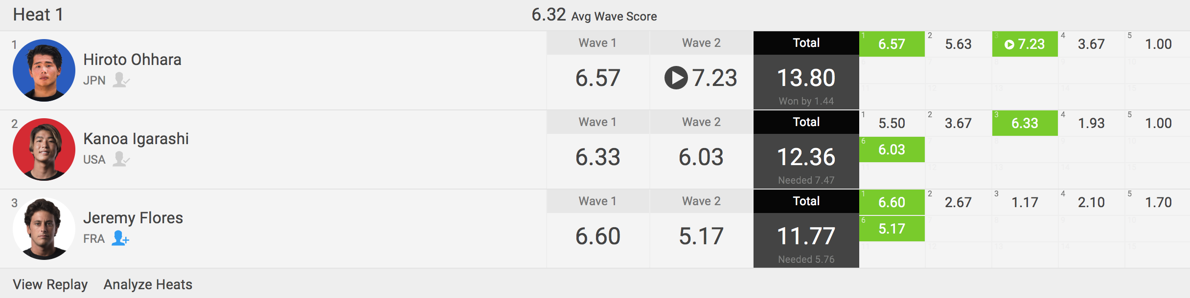 続くヒート2ではカノア五十嵐がStuart Kennedy(AUS)と対戦する予定となっている。