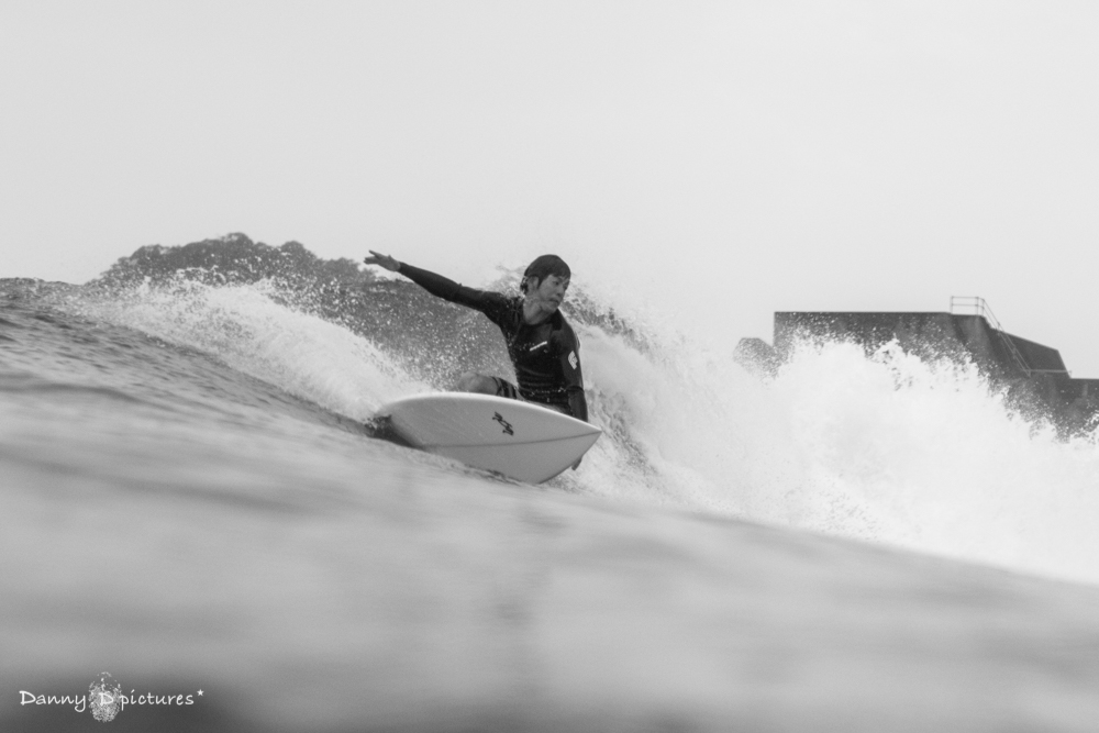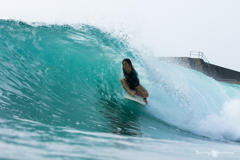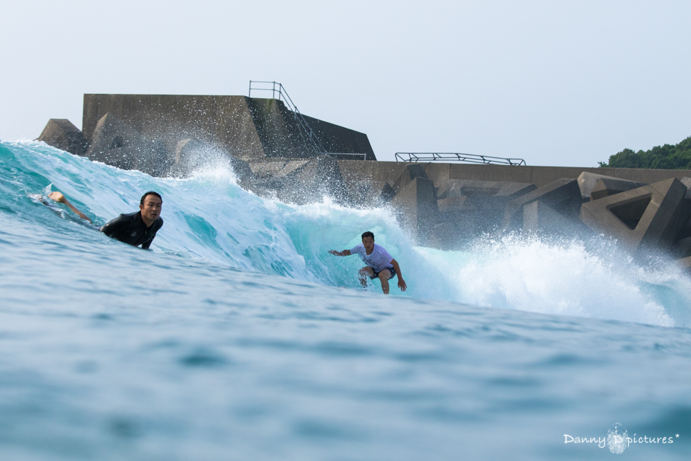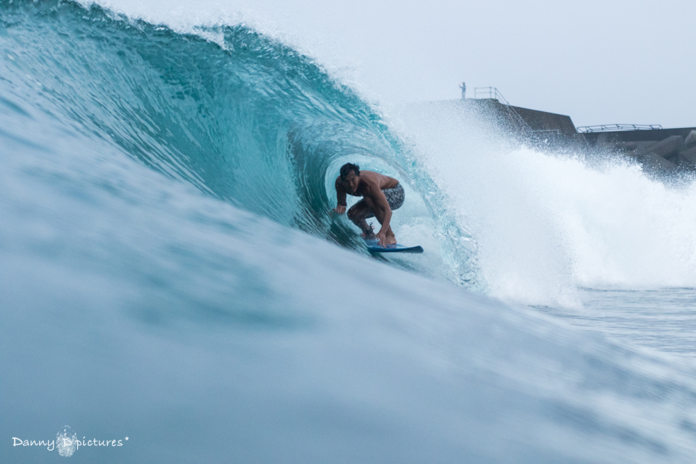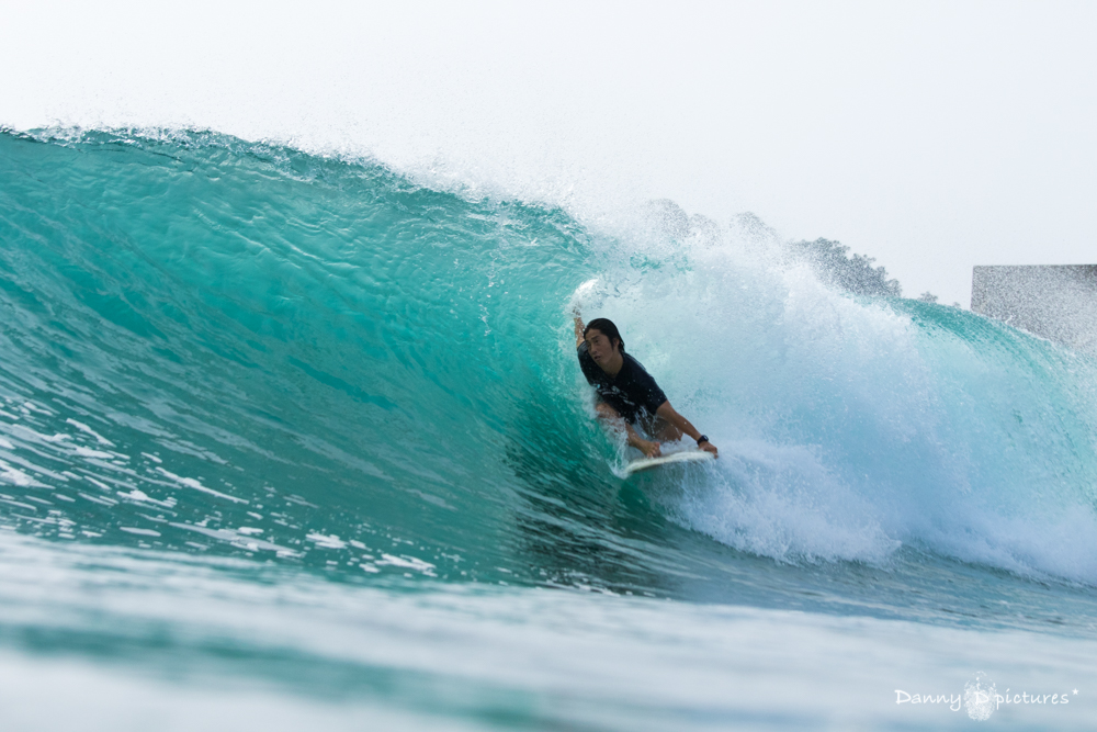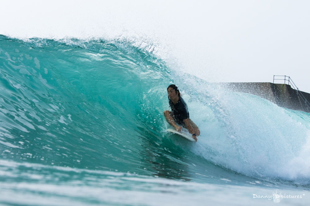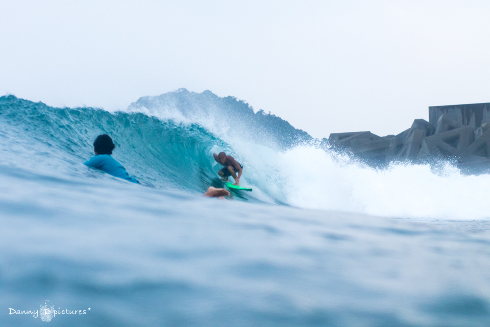 現在は地元の舞鶴でFLX surfshopを営む間屋口 峻英 proも年少時はこの場所で過ごしsurfingを磨いていただけに活き活きとsurfしていた。
