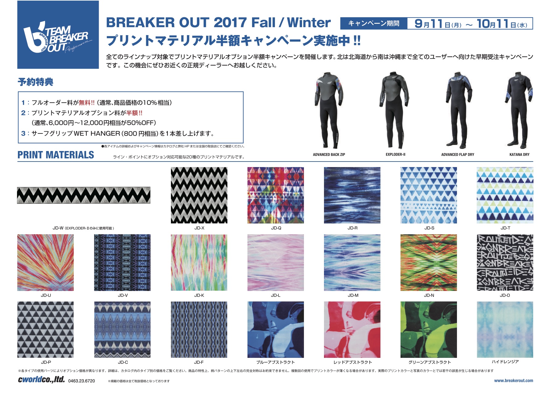 世界に誇る日本ウエットスーツ技術の中でもトップレベルのクォリティーを持つBREAKER OUT wetsuitsのすべてのラインナップを対象に、9/11(月)から10/11(火)の期間限定で”BREAKER OUT 2017 FALL / WINTERプリントマテリアル半額キャンペーン”を実施中!