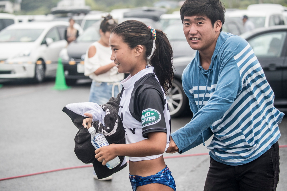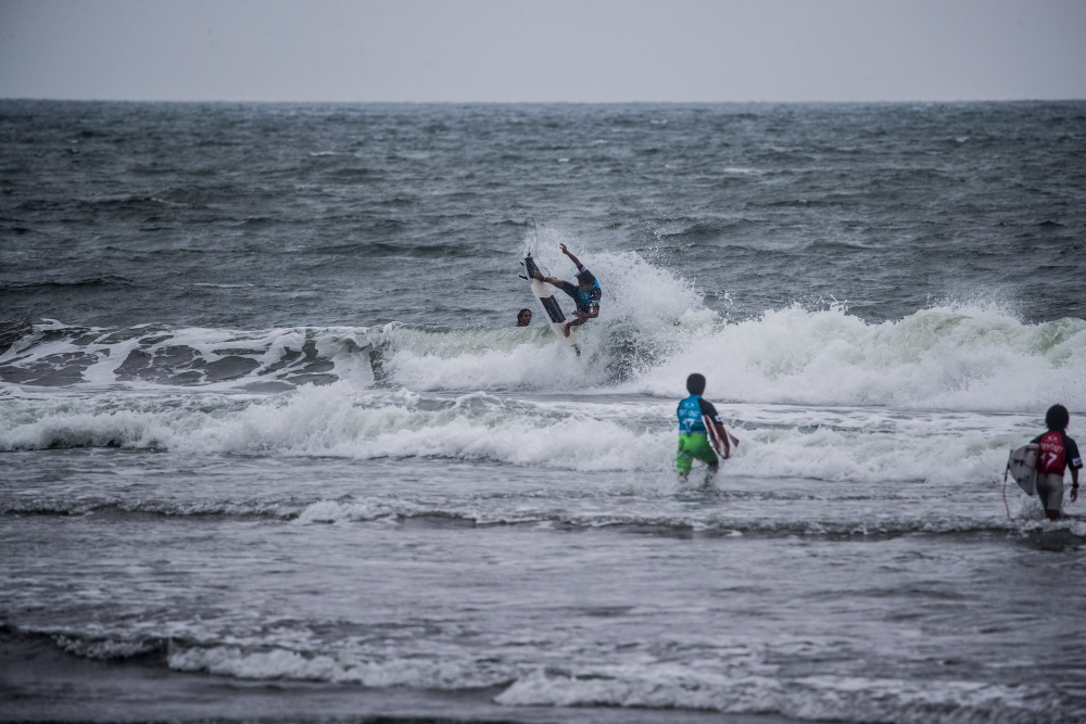 北東寄りのオンショアの影響を受けた腰腹前後の難しいコンディションの中、各クラス共に白熱したヒートが展開され、AA-Boys(U-16)は平原颯馬が、AA-Girls(U-18)は中塩佳那が、AA-Kids(U-12)は原田祥吾が、B-Kids(U-12)は新井央真が見事優勝を飾った!!