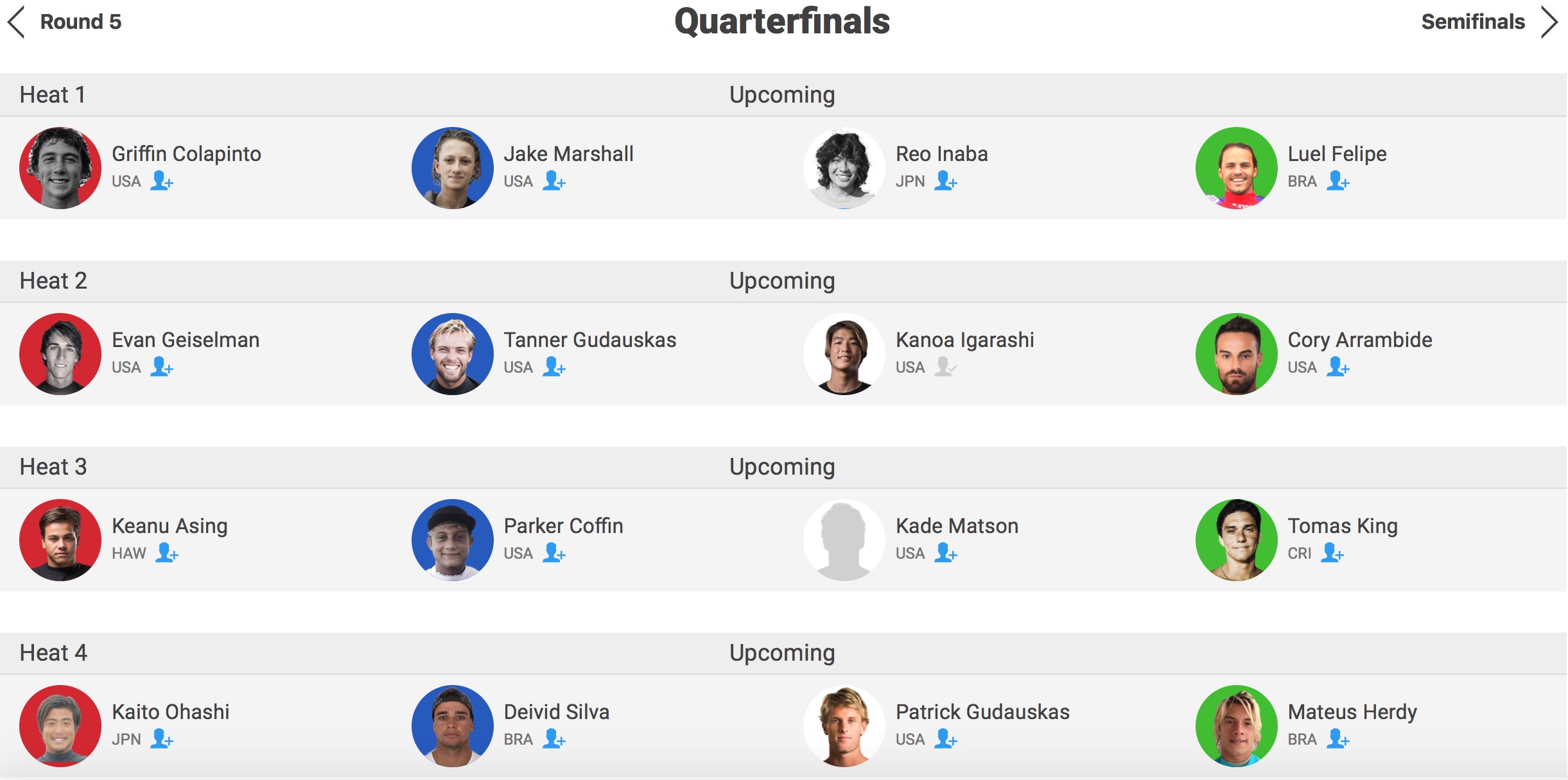 続くヒート2ではカノア五十嵐がEvan Geiselman(USA)、Tanner Gudauskas(USA)、Cory Arrambide(USA)と対戦予定。