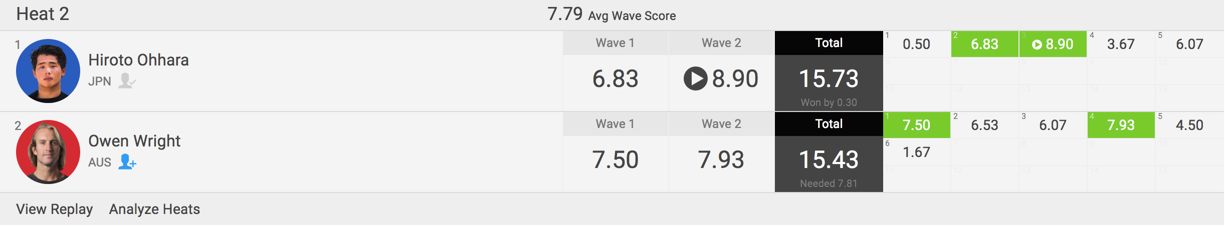 大原洋人はJohn John Florence、Italo Ferreiraと対戦となったラウンド1のヒート5ではあまりいいところを見せられなかったが、CTランキング4位のOwen Wrightとのマンオンマンとなったラウンド2のヒート2では8.90ptのエクセレント・スコアを叩き出してトータルスコア15.73ptをマークし、見事ラウンドアップ!!