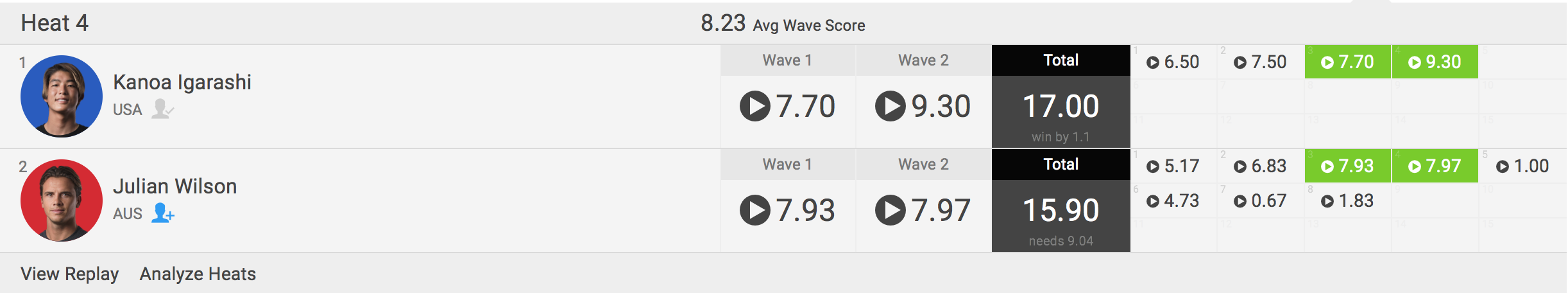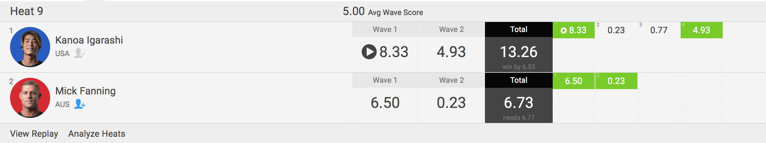 新ルール導入によりMick Fanningと再度試合するハメとなったカノア五十嵐だったが、見事再びMick Fanningを粉砕し、さらにラウンド5ではJulian Wilsonを倒してクォーターファイナルへと駒を進め、そこで優勝のFilipe Toledoに敗北を喫するも本イベントを5位でフィニッシュ。