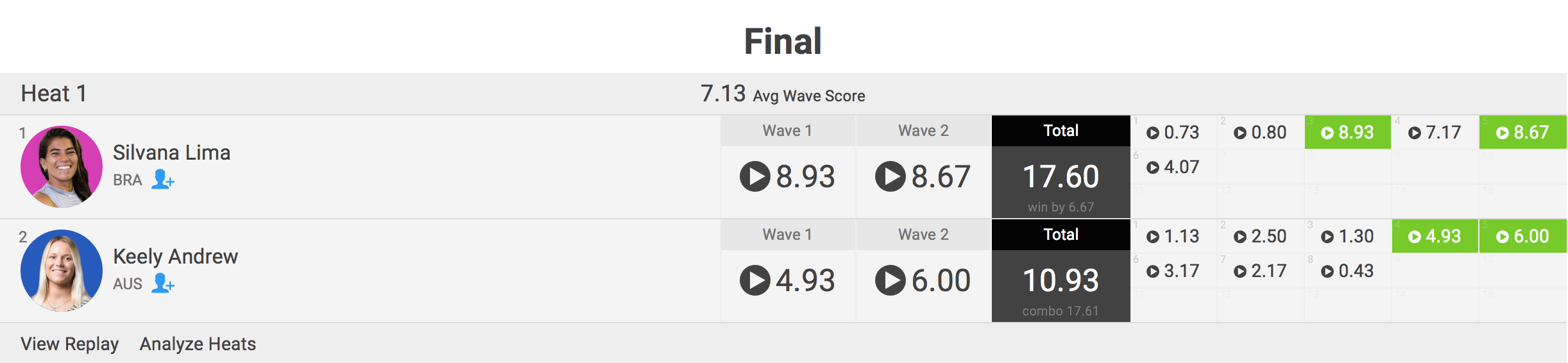 WOMENS CT”SWATCH PRO”のファイナルはブラジルのSilvana LimaがKeely Andrewを相手に2本のエクセレントスコアをマークし、トータルスコア17.60ptで見事優勝!