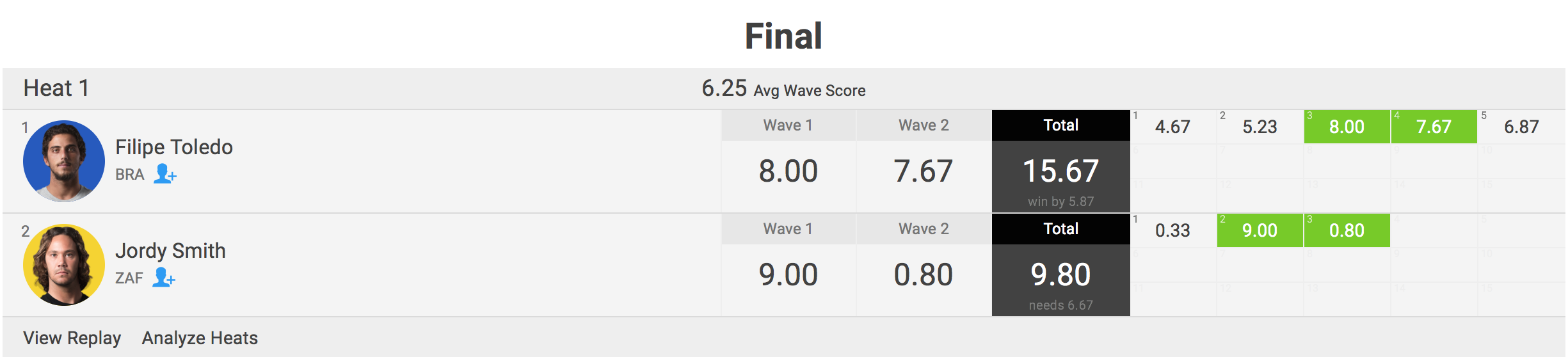 MENSファイナルはFilipe ToledoとJordy Smithの一騎打ちとなり、波数が非常に少ない中、ヒート開始早々から積極的に波を掴んでが3本目に8.00pt、4本目に7.67ptとスコアを重ねていったFilipe Toledoに対し、終始プライオリティーを保持してじっくりといい波を待ち続け、9.00ptを叩き出していたにも関わらず、最後までバックアップに必要な6.67ptを出せる波を掴むことができなかったJordy Smithを下し、見事”HURLEY PRO at Trestes”を制した!!