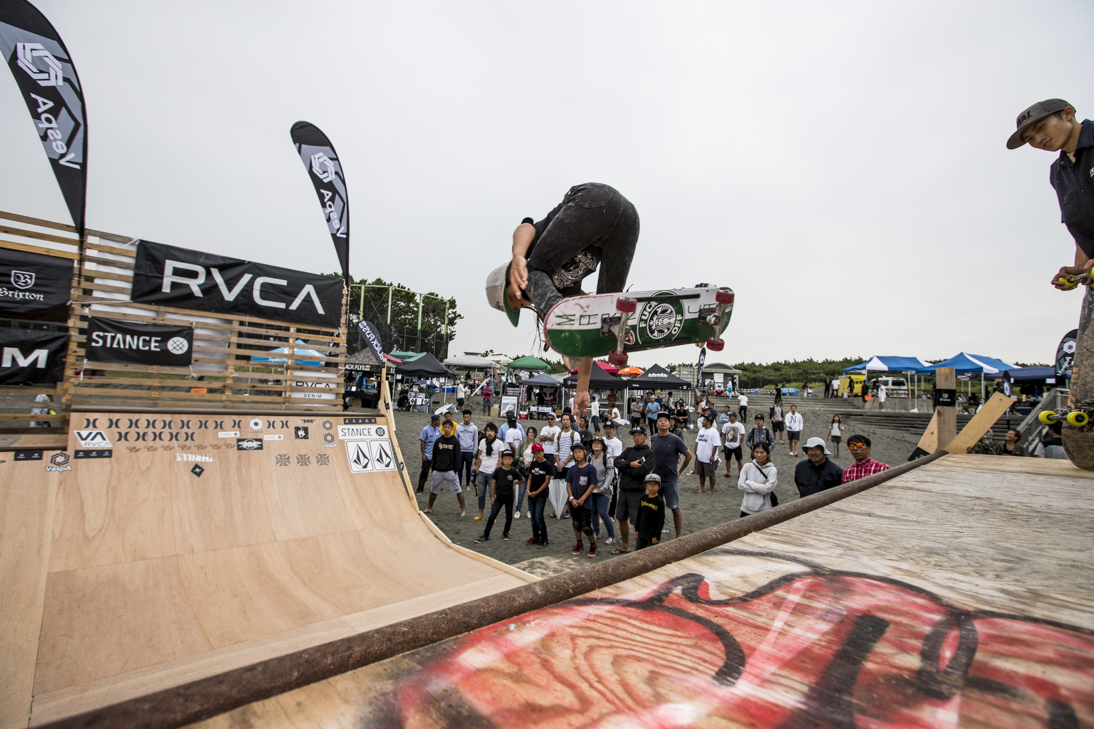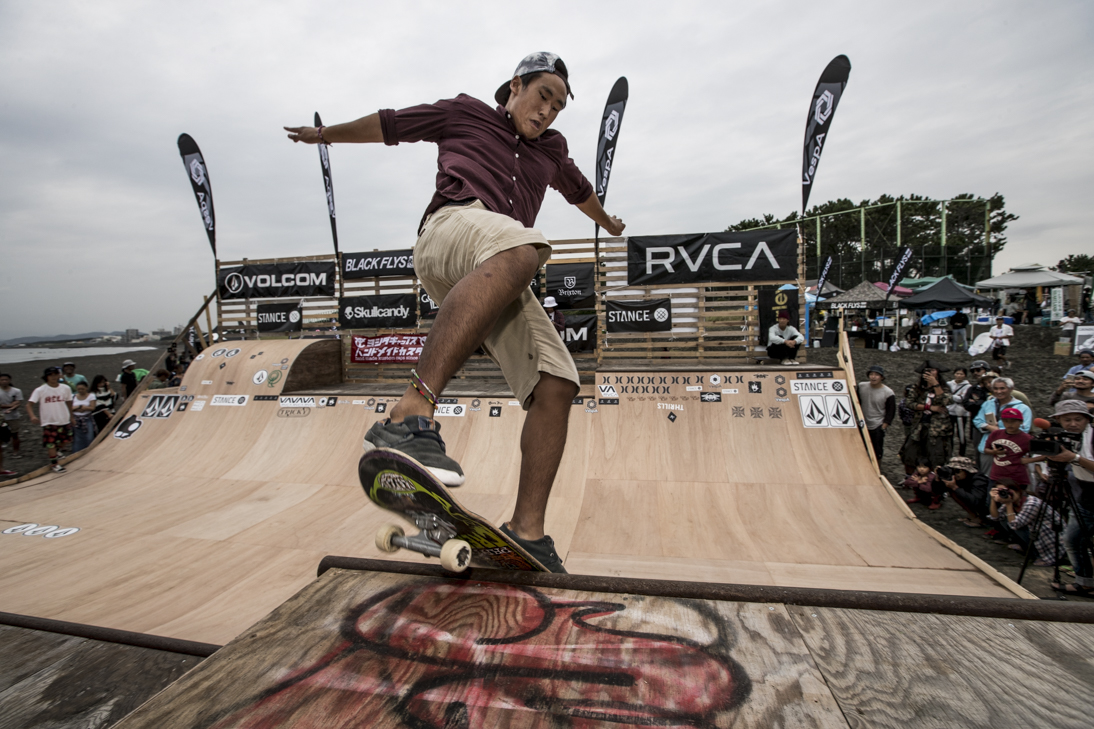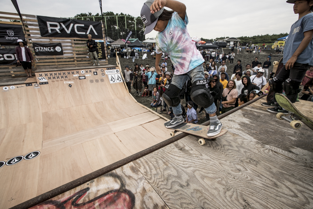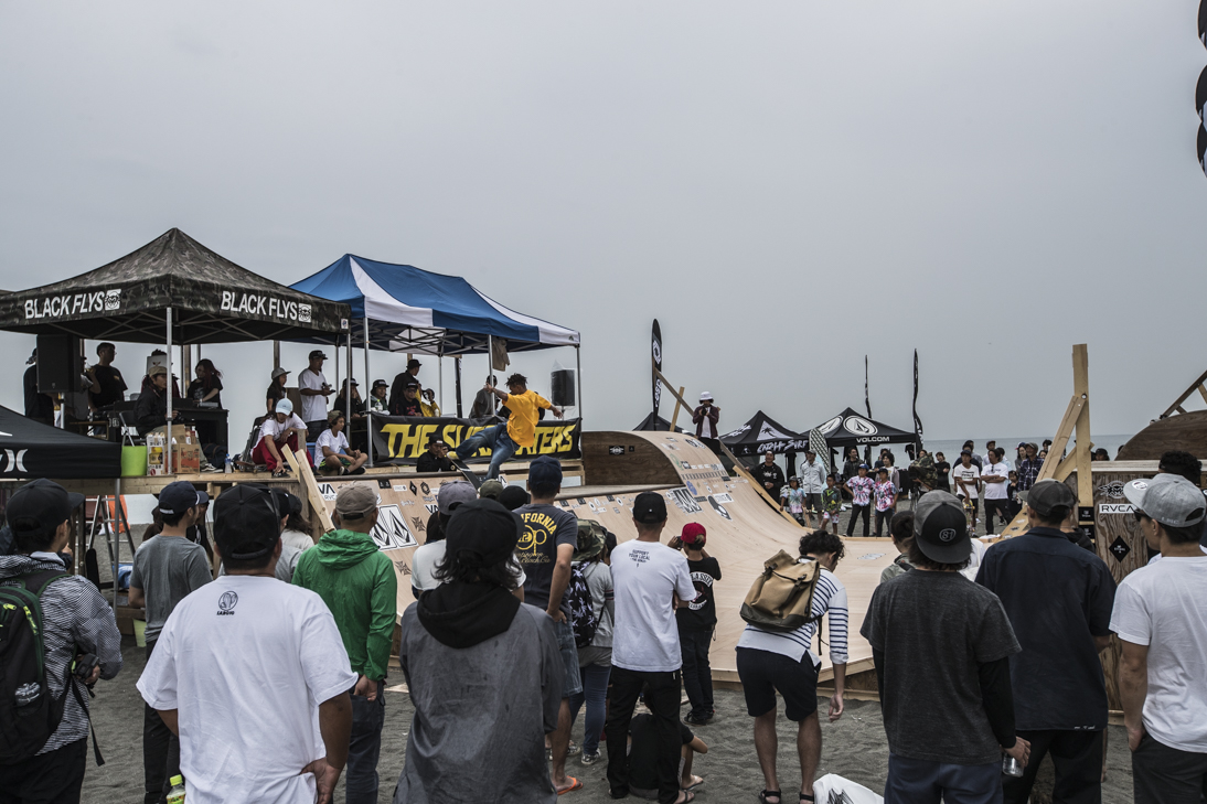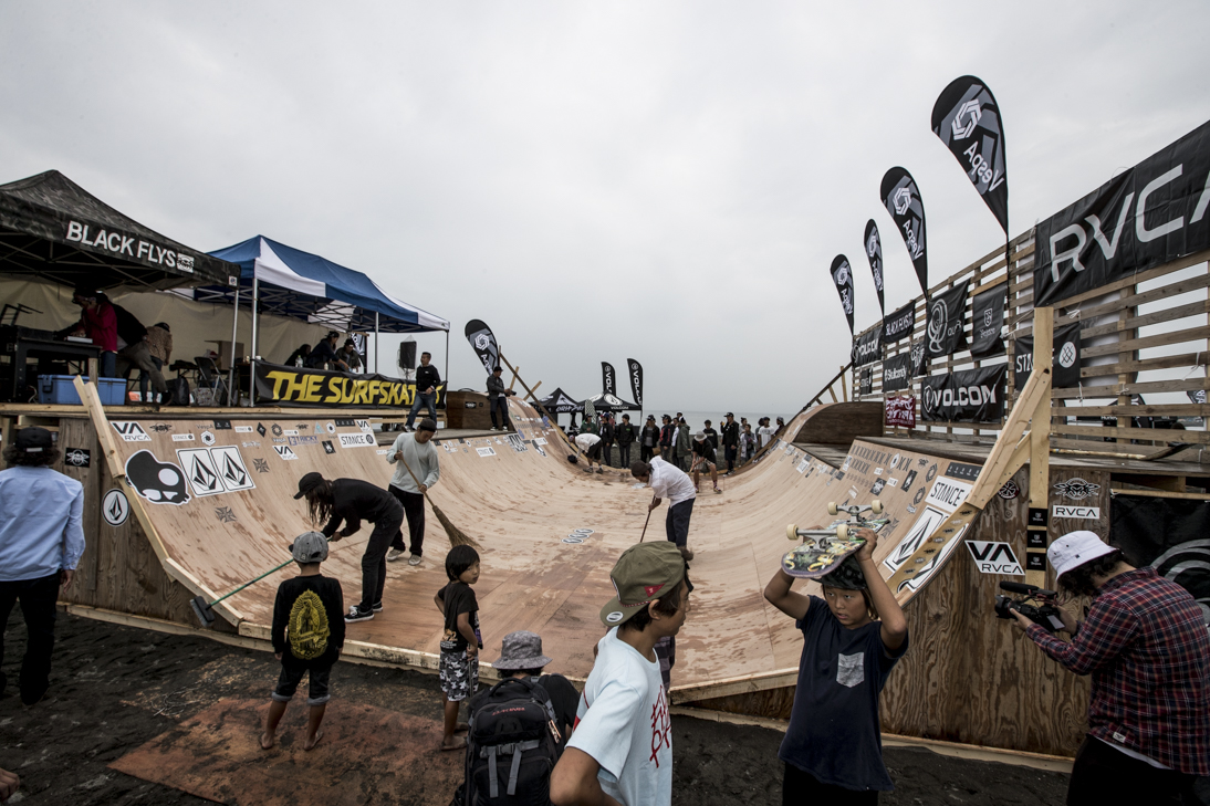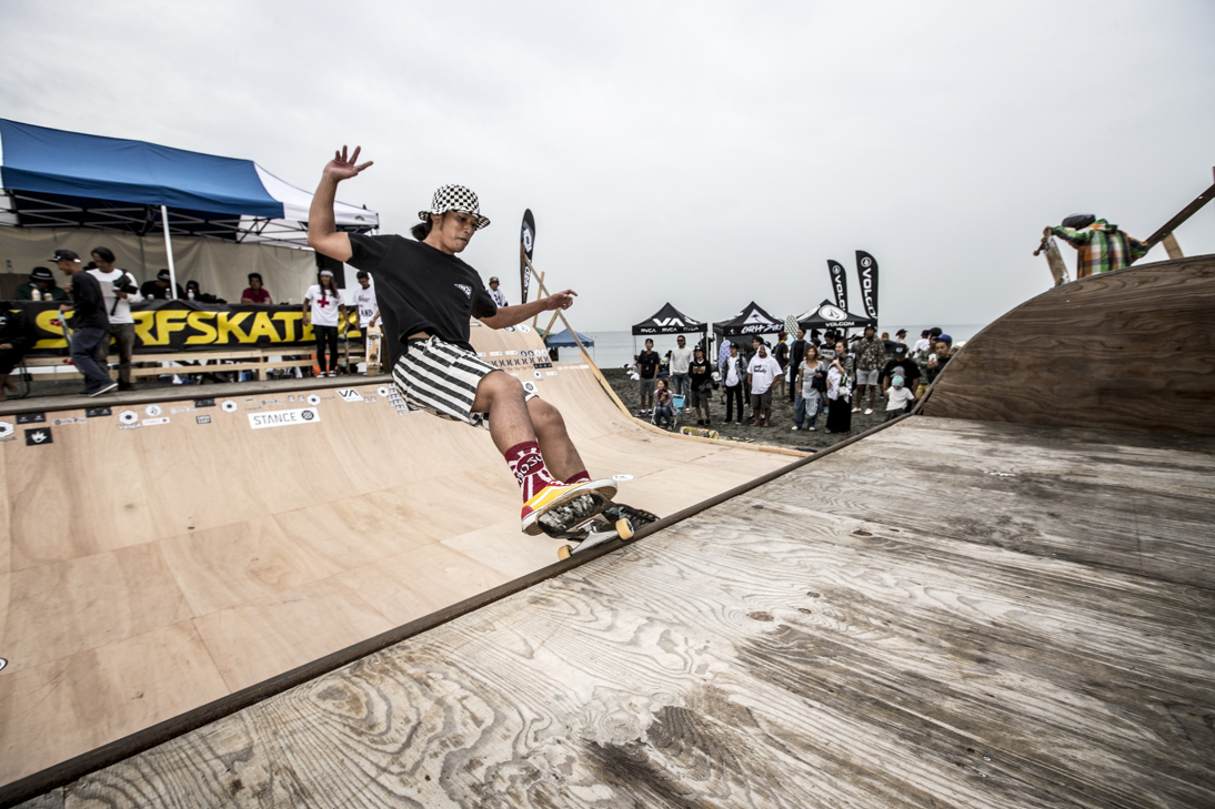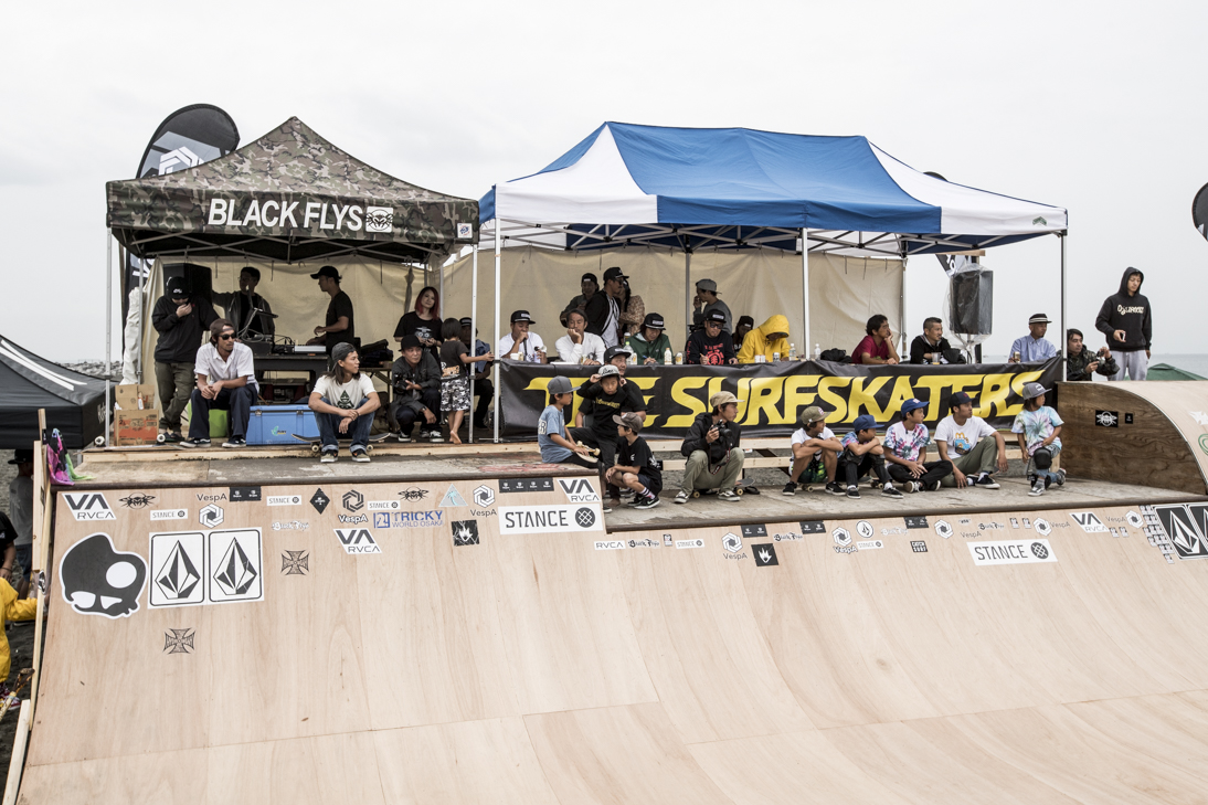 THE SURFSKATERS 16のDAY1となる9/16(土)は、波は非常に波数の少ない腰前後の小波でコンテストには適さないという判断から、スケート部門からスタート。