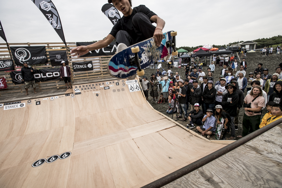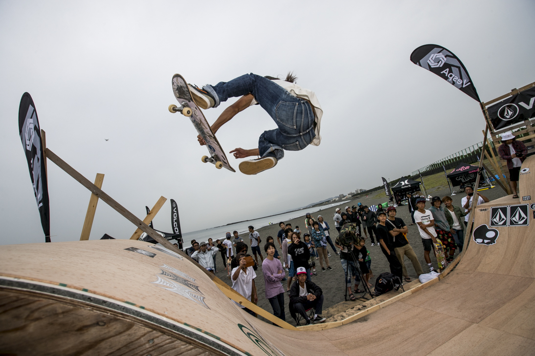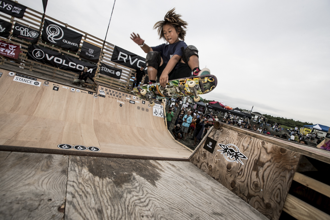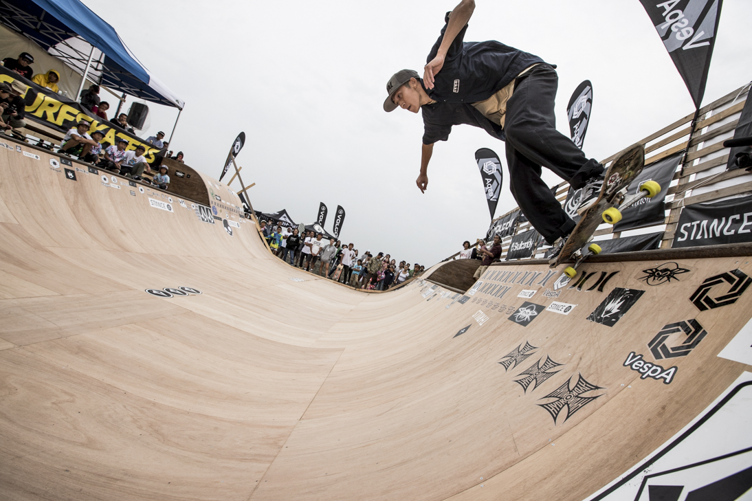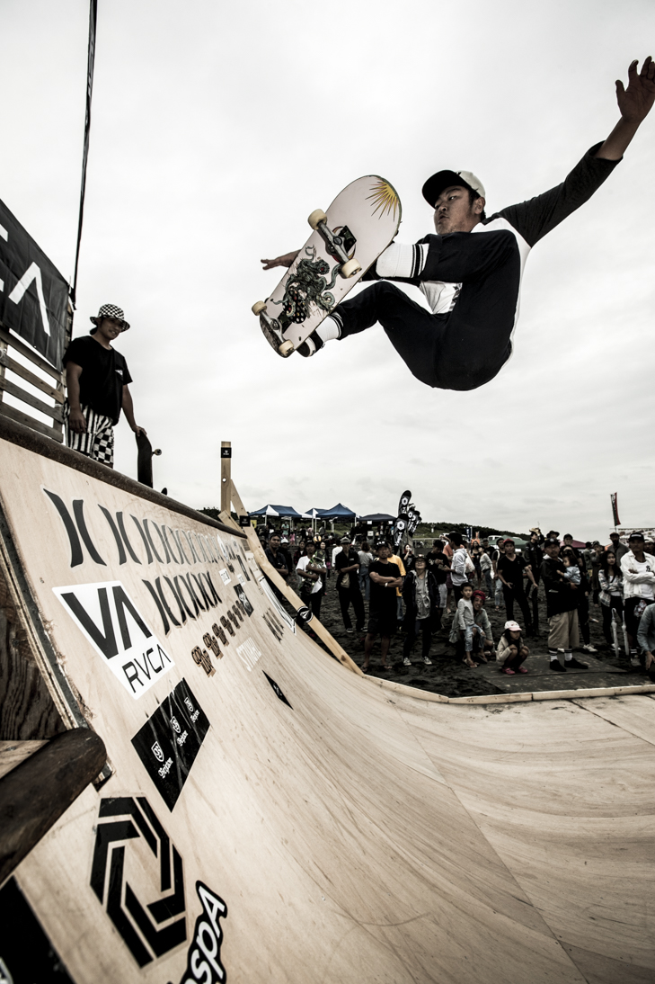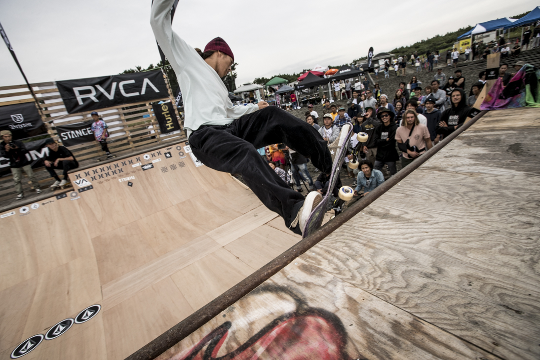 THE SURFSKATERS 16のDAY1となる9/16(土)は、波は非常に波数の少ない腰前後の小波でコンテストには適さないという判断から、スケート部門からスタート。