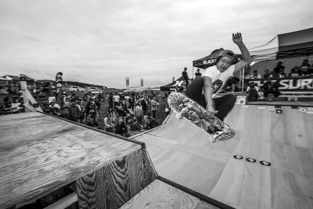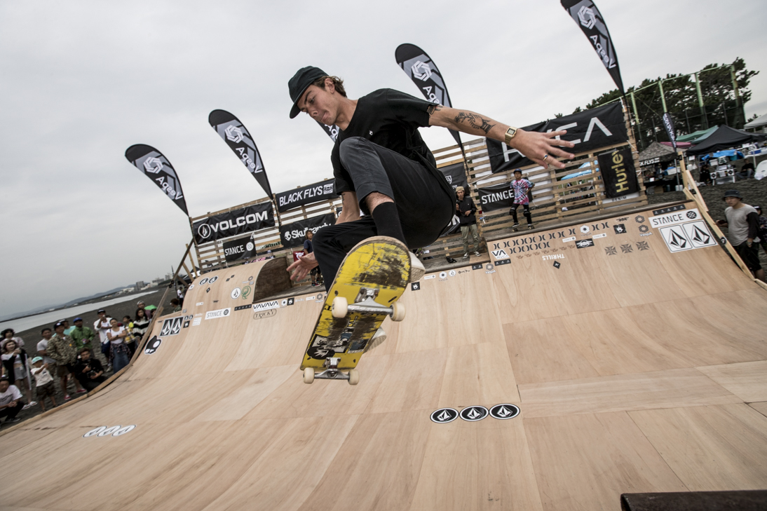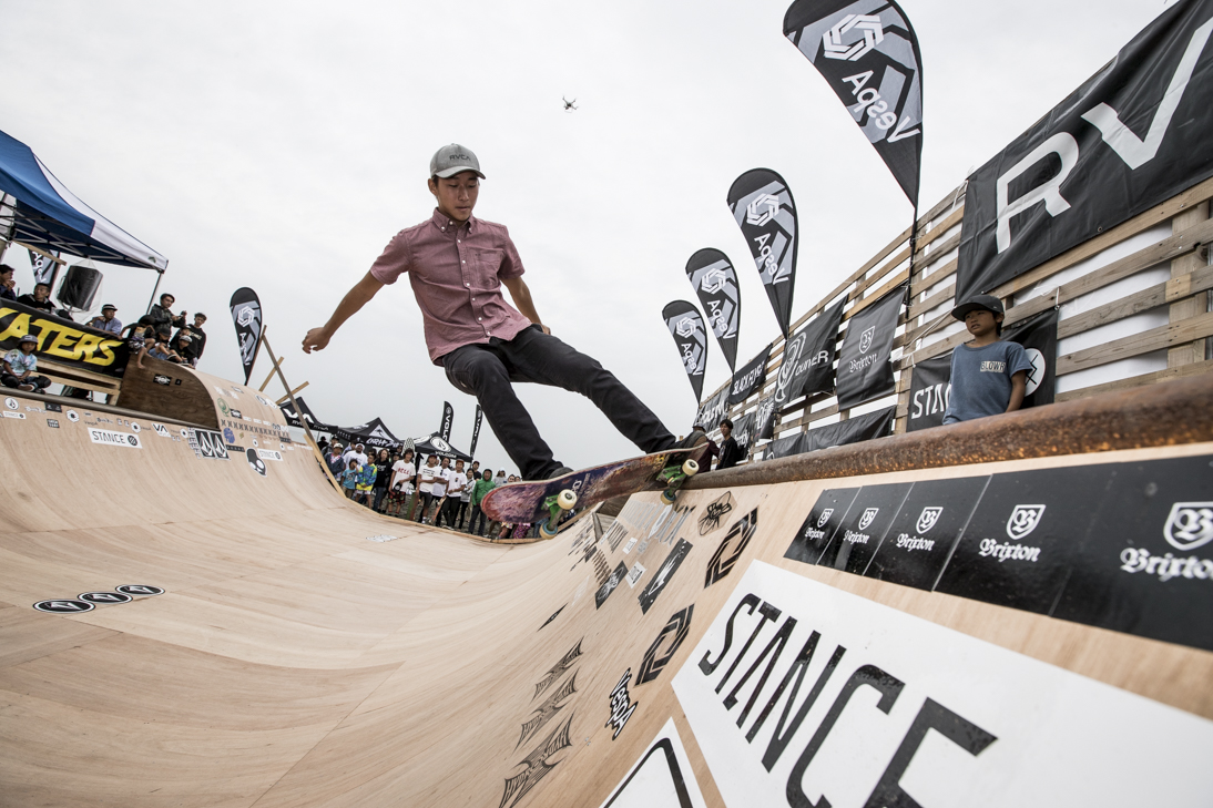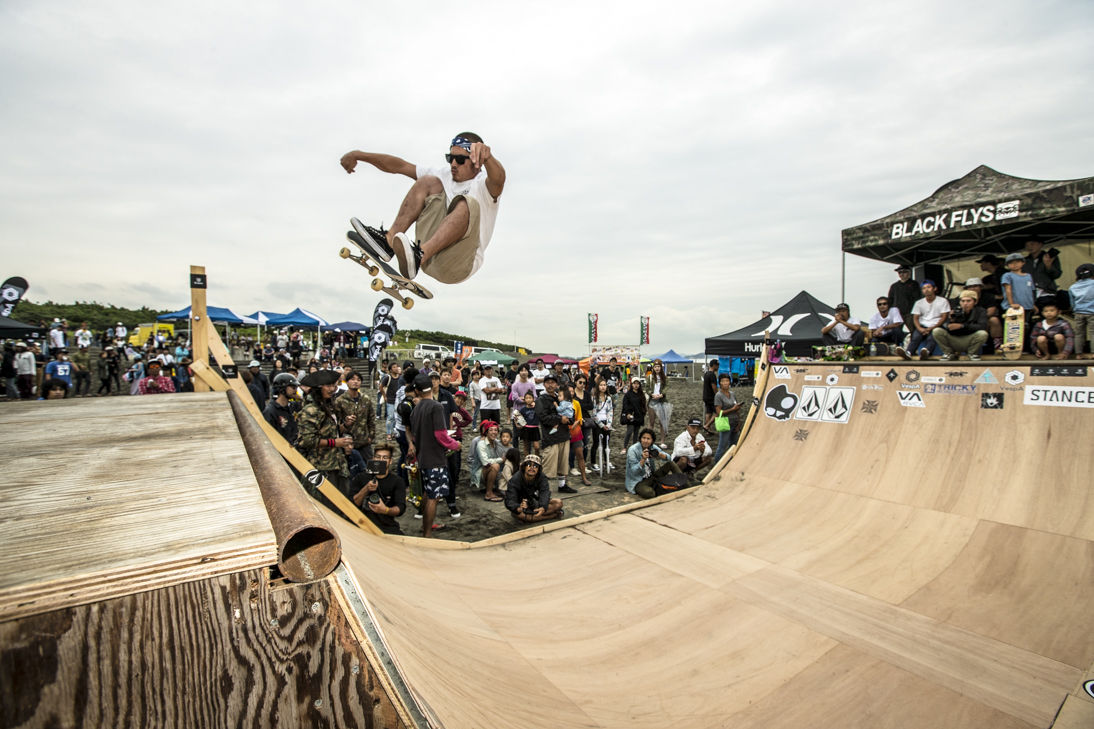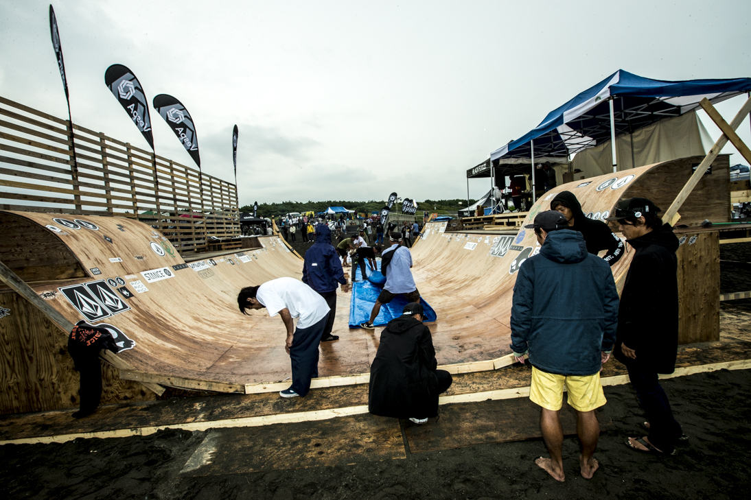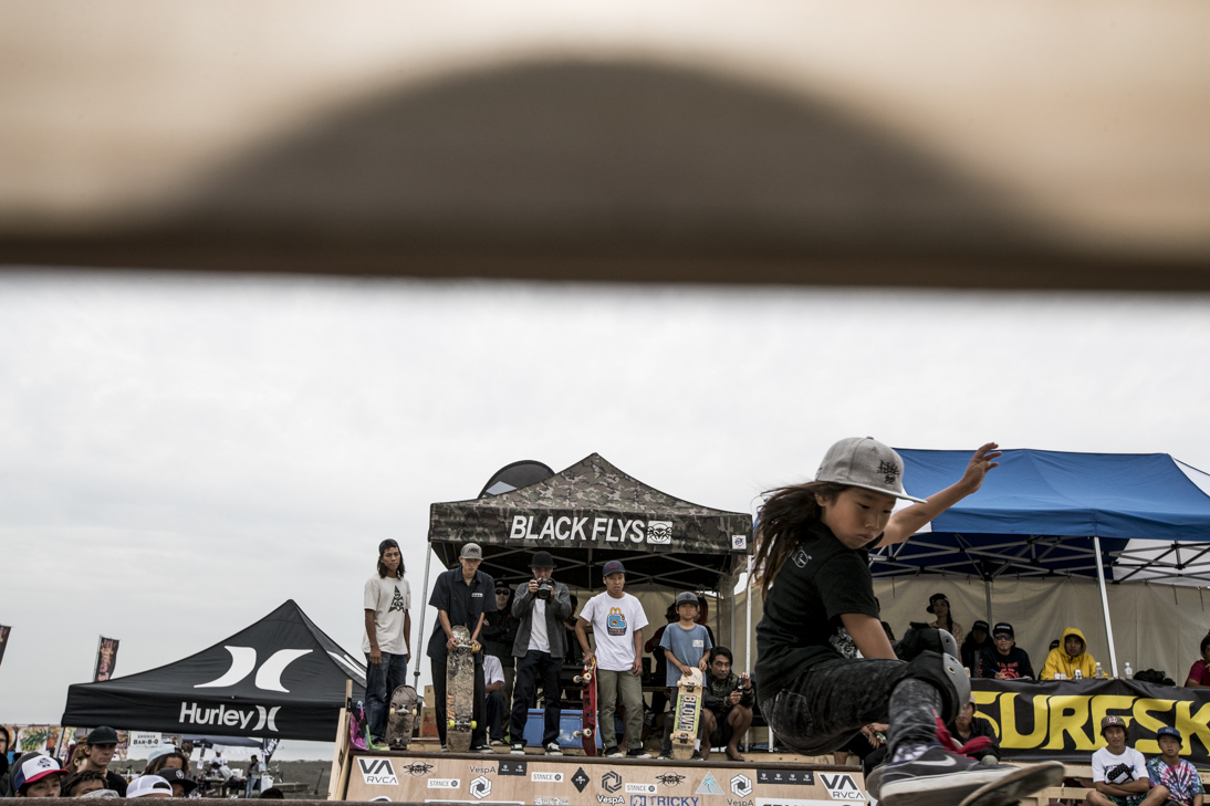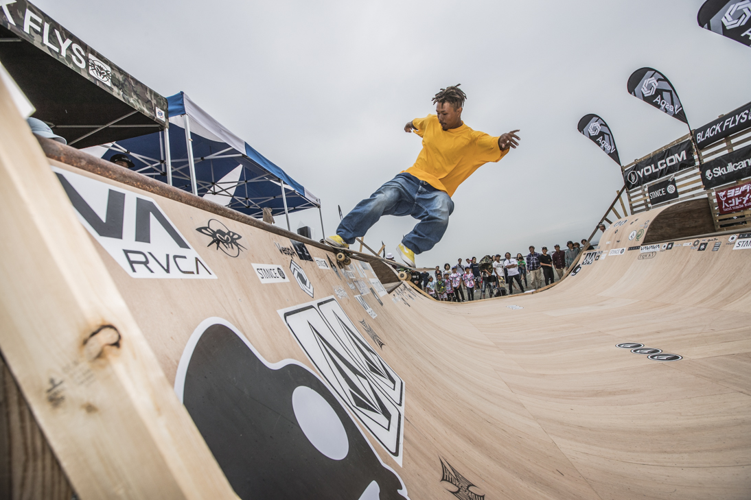 THE SURFSKATERS 16のDAY1となる9/16(土)は、波は非常に波数の少ない腰前後の小波でコンテストには適さないという判断から、スケート部門からスタート。