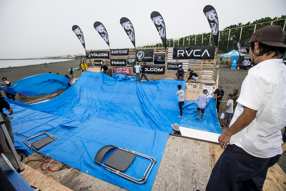 しかし、9/17(日)現在、九州に上陸中の台風18号の影響を受け、雨に見舞われてしまったことから、フリーククラスのヒート3までを消化したところで止む無くコンテストを中断となった。