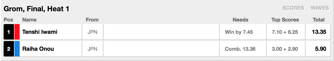 コンディションやレベルによってはコーチが一緒にパドルアウトしてサポートしてあげることも可能な12歳以下のグロムのファイナルは、コンテストDAY1に行われたチームチャレンジで抜群のチームワークを見せた親友でありライバル同士の小濃来波と岩見天獅の一騎打ち。