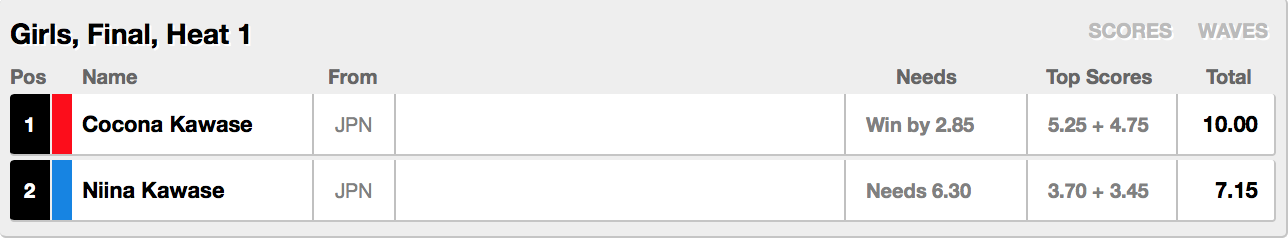 しなやかな膝を生かしたスタイリッシュなサーフィンを武器に、妹の川瀬心那が優勝となった。