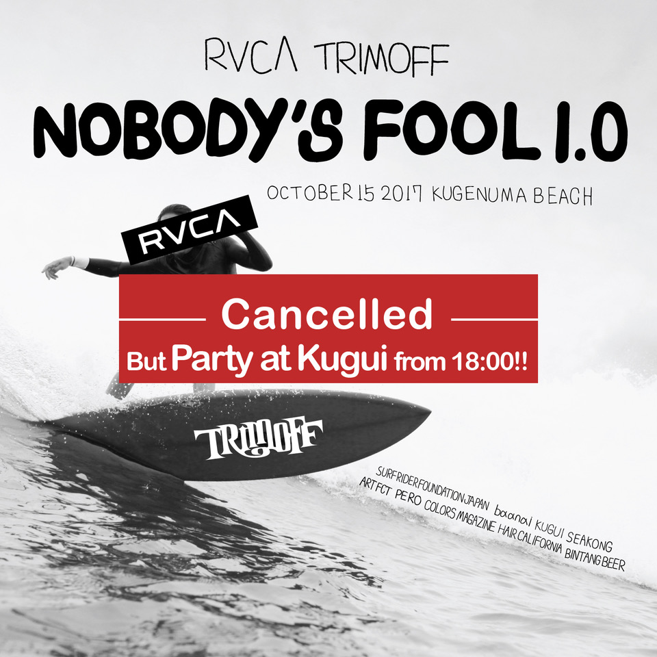 さらに、10/15(日)に鵠沼で開催予定だったRVCAとショーロクこと宮内謙至のTRIMOFFによるどんなボードでも参加OKなコンテスト”NOBODY’S FOOL 1.0″は当日の天候と波のコンディションが不十分ということで中止が決定。