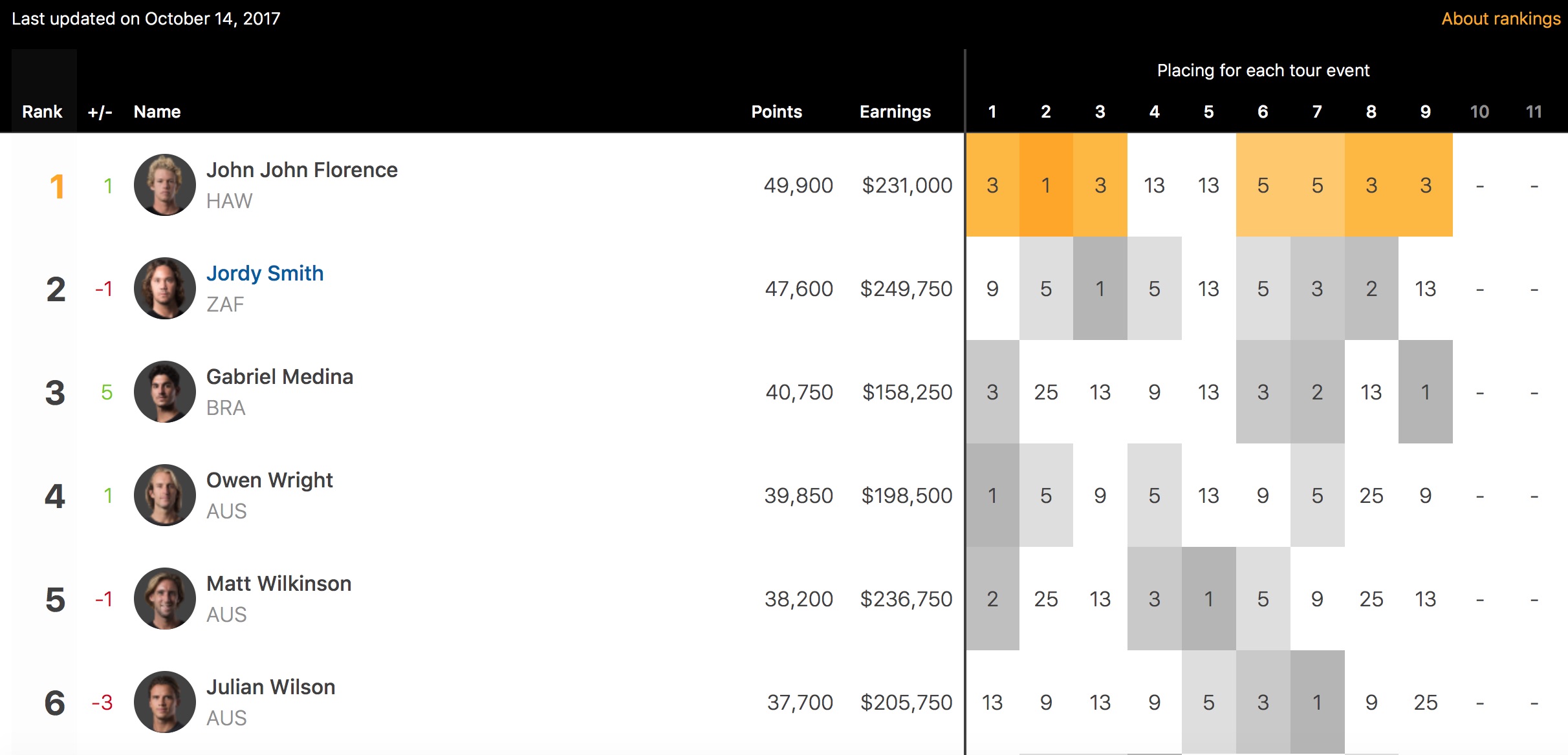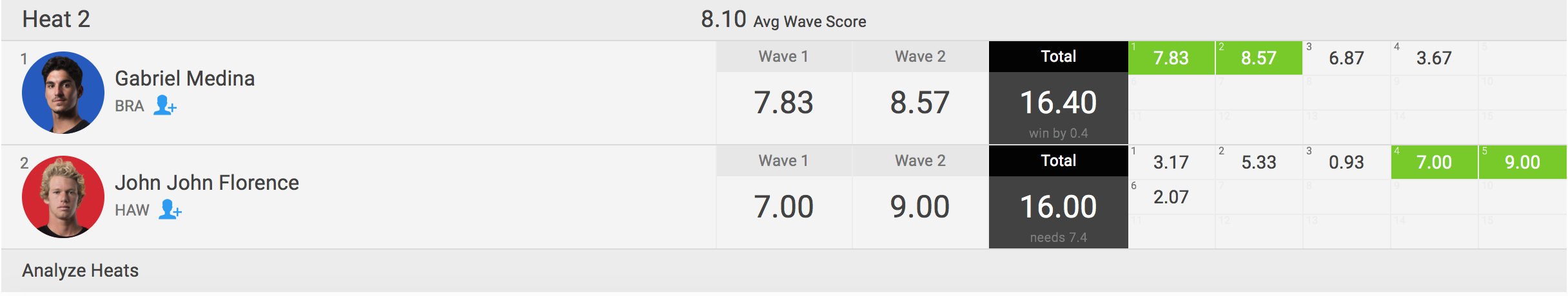 この日一番エキサイティングな名勝負になったと言って過言ではないセミファイナルのヒート2でGabriel Medinaに敗れたJohn John Florenceは、3位でフィニッシュとなったもののCTランキング1位を独走していたJordy Smith(ZAF)を抑えてCTランキングトップの座へ!!