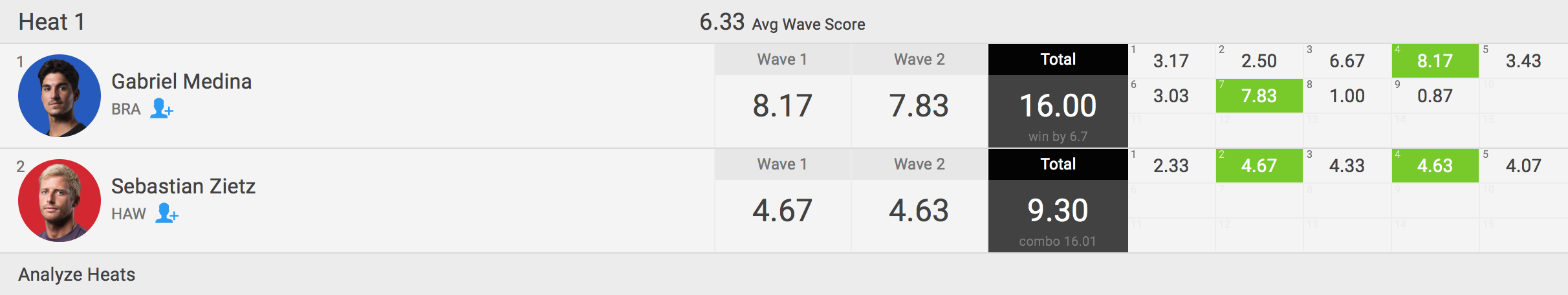 注目のMENSファイナルは、セミファイナルのヒート1でKolohe Andino(USA)に逆転勝利を果たしたSebastian Zietz(HAW)と、セミファイナルのヒート2でJohn John Florence(HAW)と大接戦を繰り広げた末に僅差で勝利したGabriel Medina(BRA)との対戦。