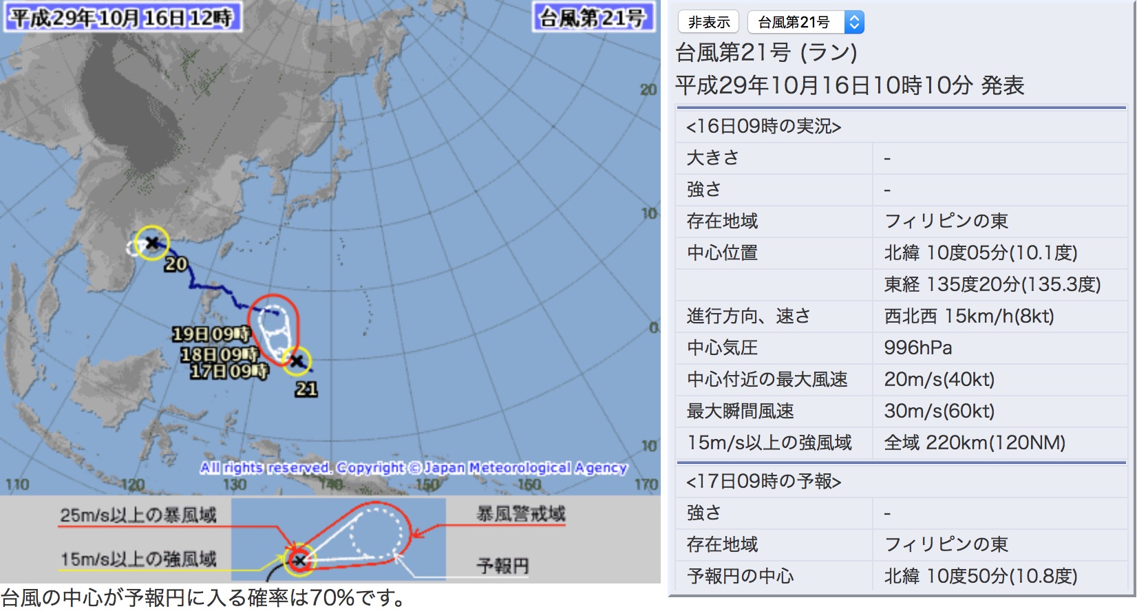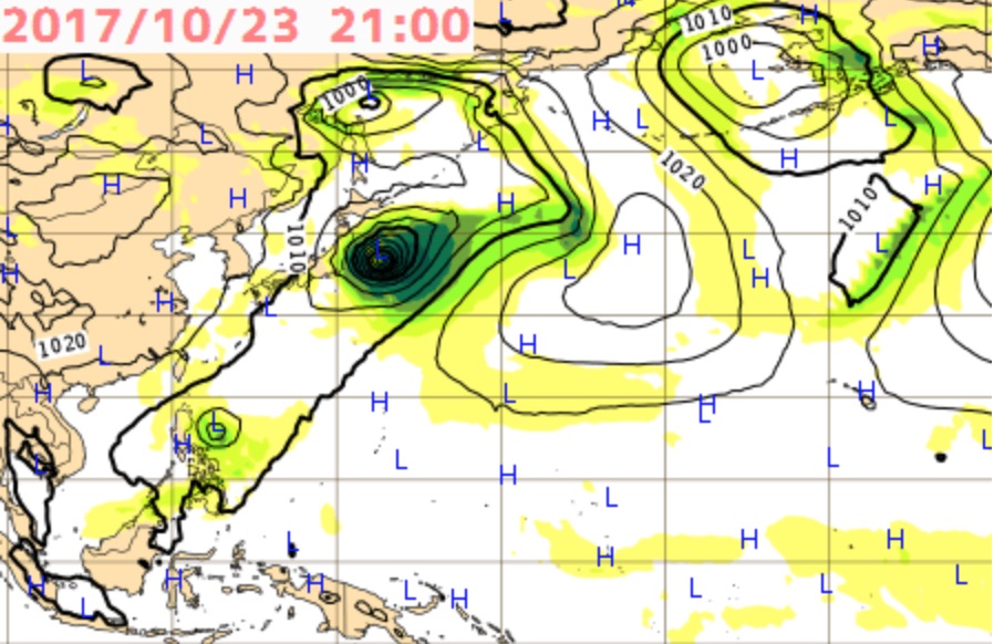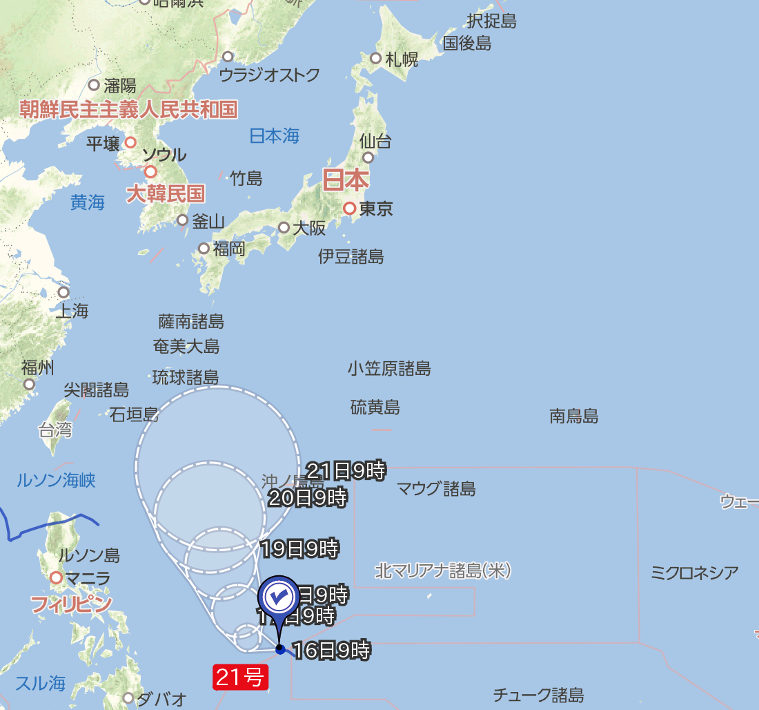10/16(月)正午過ぎ現在、フィリピンの東に位置し、中心気圧が996hpa、15km/hの速度で西北西へ進路を取り、予想によれば10/17(火)より徐々に進路を北に取り始め、10/21(土)には沖ノ鳥島付近に達する見込み。
