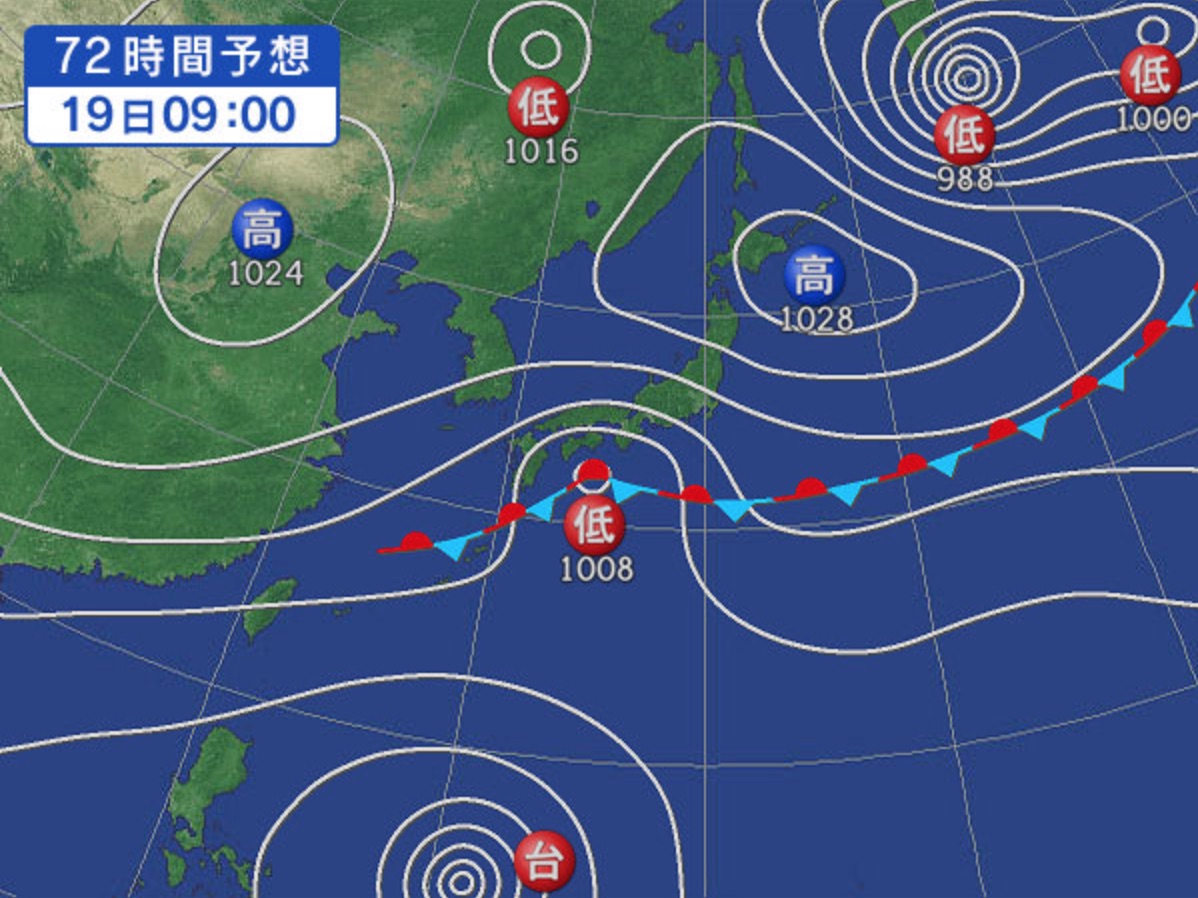 この頃には南向きのコーストラインにグランドスウェルが届けられる可能性が高いと思われるが、現在も関東から九州にかけて雨をもたらしている日本列島の南海上に張り出す勢力の強い前線の動き次第では、せっかくのグランドスウェルが抑えられてしまったり、前線に吸い込まれて熱帯低気圧か温帯低気圧に変わってしまう可能性もなきにしろあらずな状況となっているが、