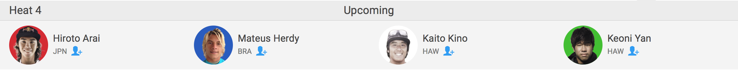新井洋人と喜納海人は、ラウンド1のヒート4で同じヒートに組み込まれ、Mateus Herdy(BRA)、Keoni Yan(HAW)と対戦予定。