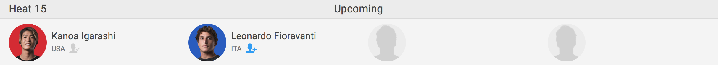 ヒート15でLeonardo Fioravanti(ITA)ほかラウンド2から勝ち上がってきた2名の選手と戦う予定となっている。