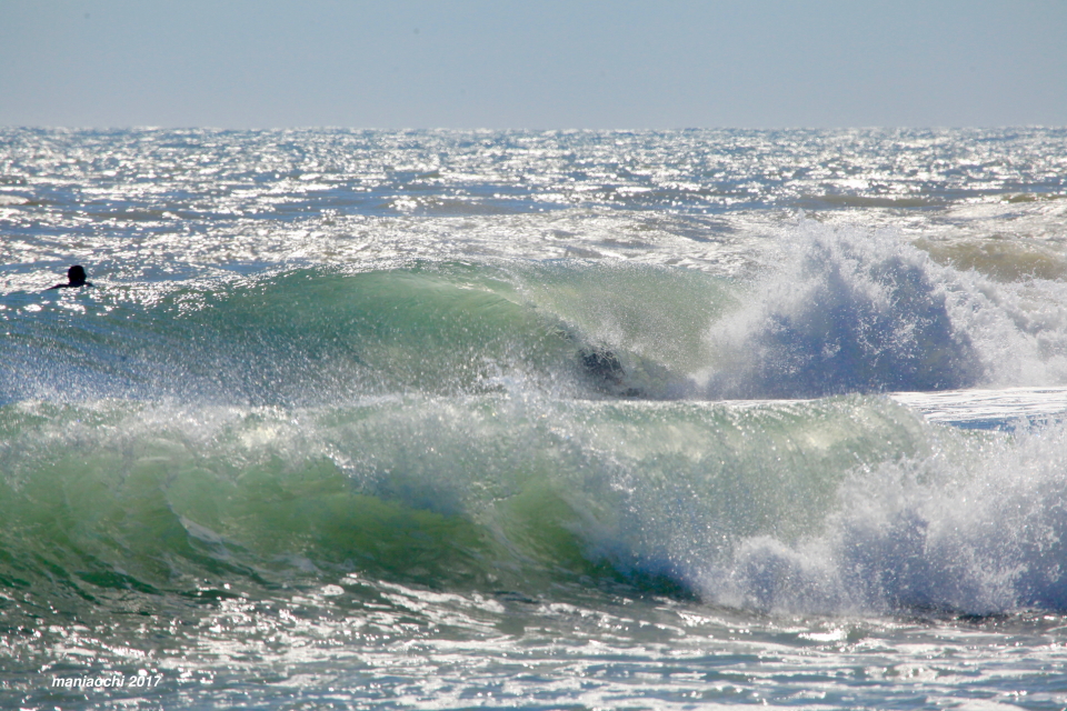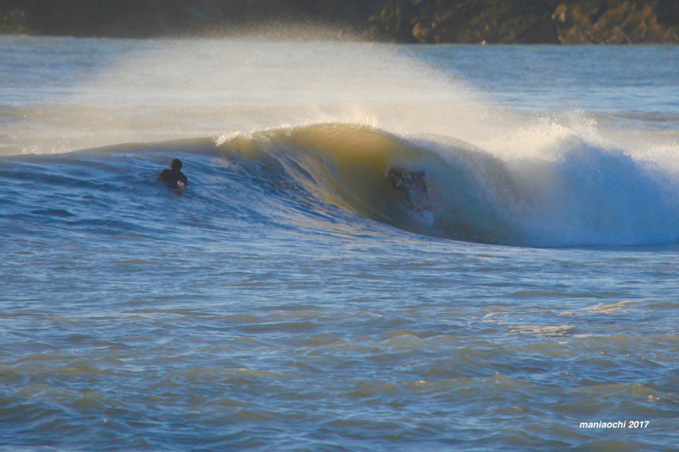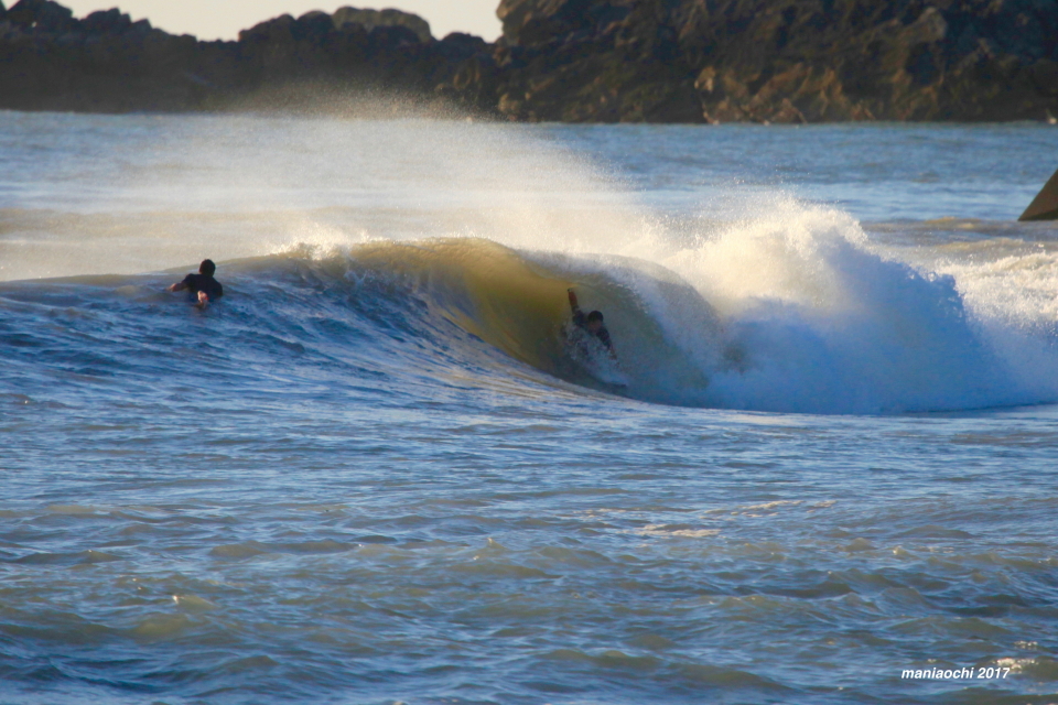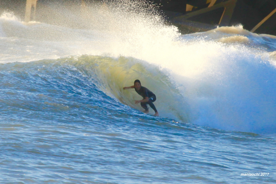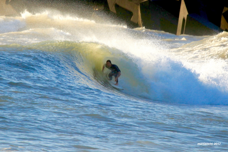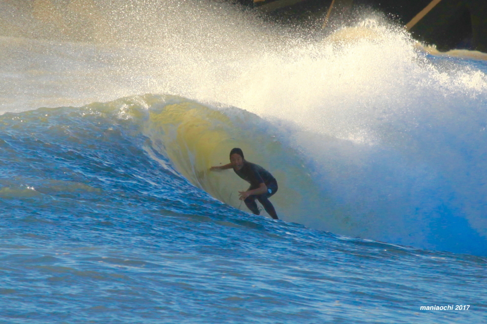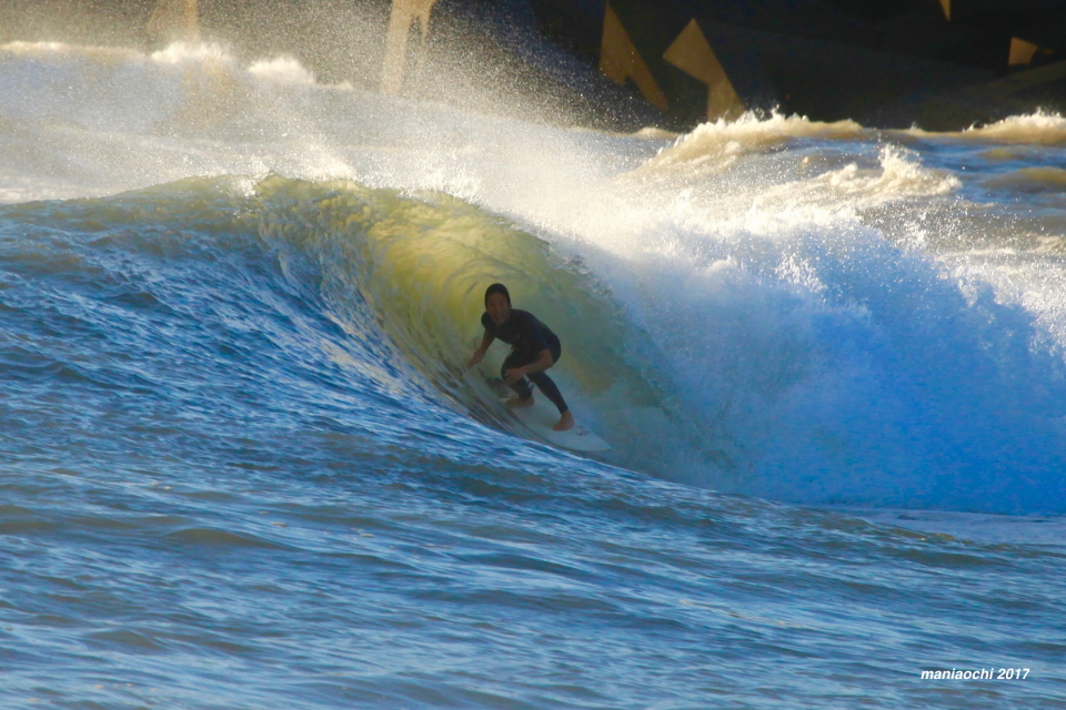 川から流れ出すあまりの流れの強さにテイクオフポジションをまともに維持するにもひたすらパドリングでキープしながらサンドバーにヒットしたセットにタイミングを合わせるというタフコンディション。
