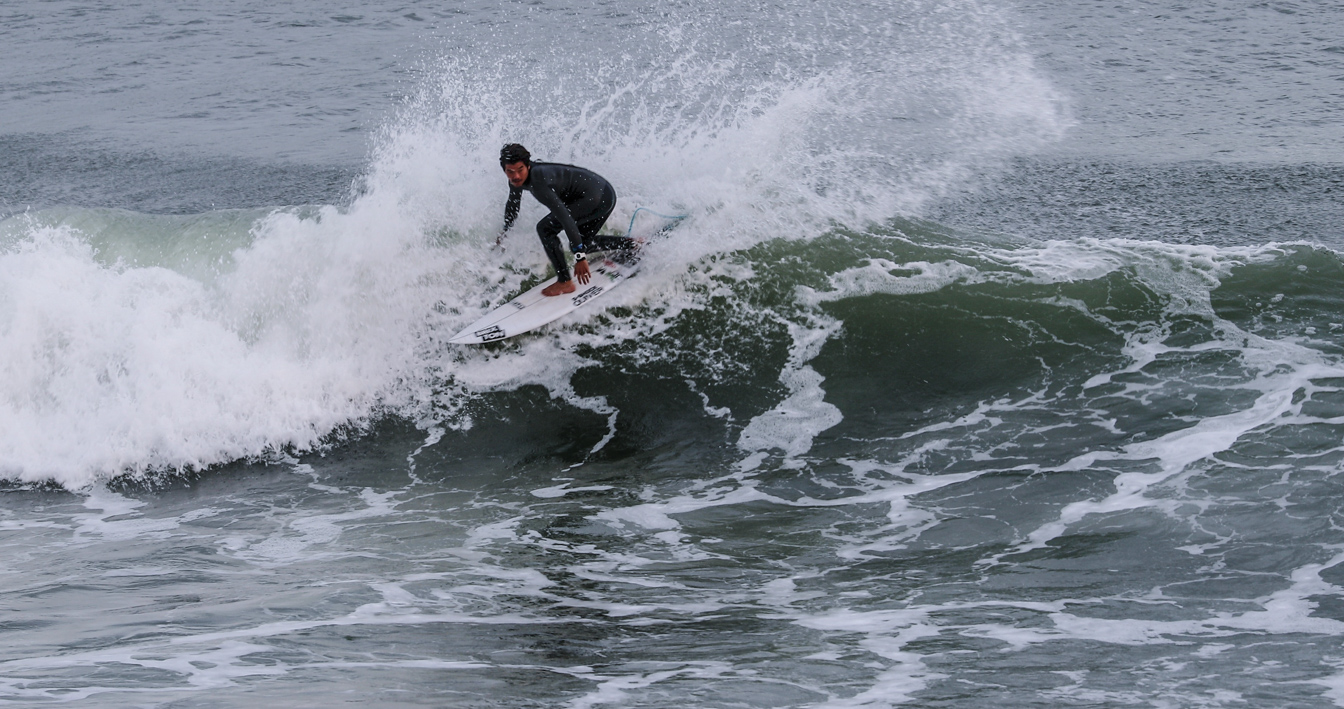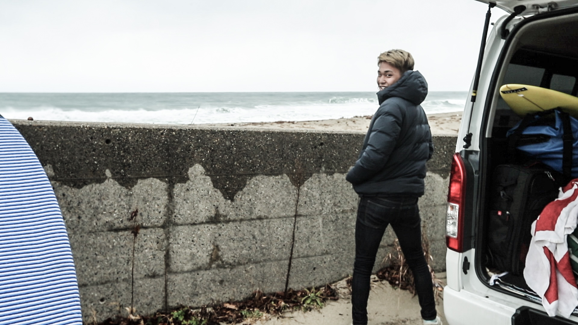仙台新港のパイオニアとして知られるレジェンドサーファーの越後一雄氏の息子で、プロサーファーでもあり現在はDUSK wetsuitsを営む越後将平のサーフショップ”Bare Foot Surf”を拠点に、トリップ初日の11/19(日)は低気圧からの南うねりによって日本一のビーチブレイク仙台新港が頭前後になるかと予想を立てていたが見事にうねりが入るタイミングが遅れ、夕方までに間に合わず、駐車場で合流した仙台新港ロコボーイの熊谷航と軽いウォームアップセッション。