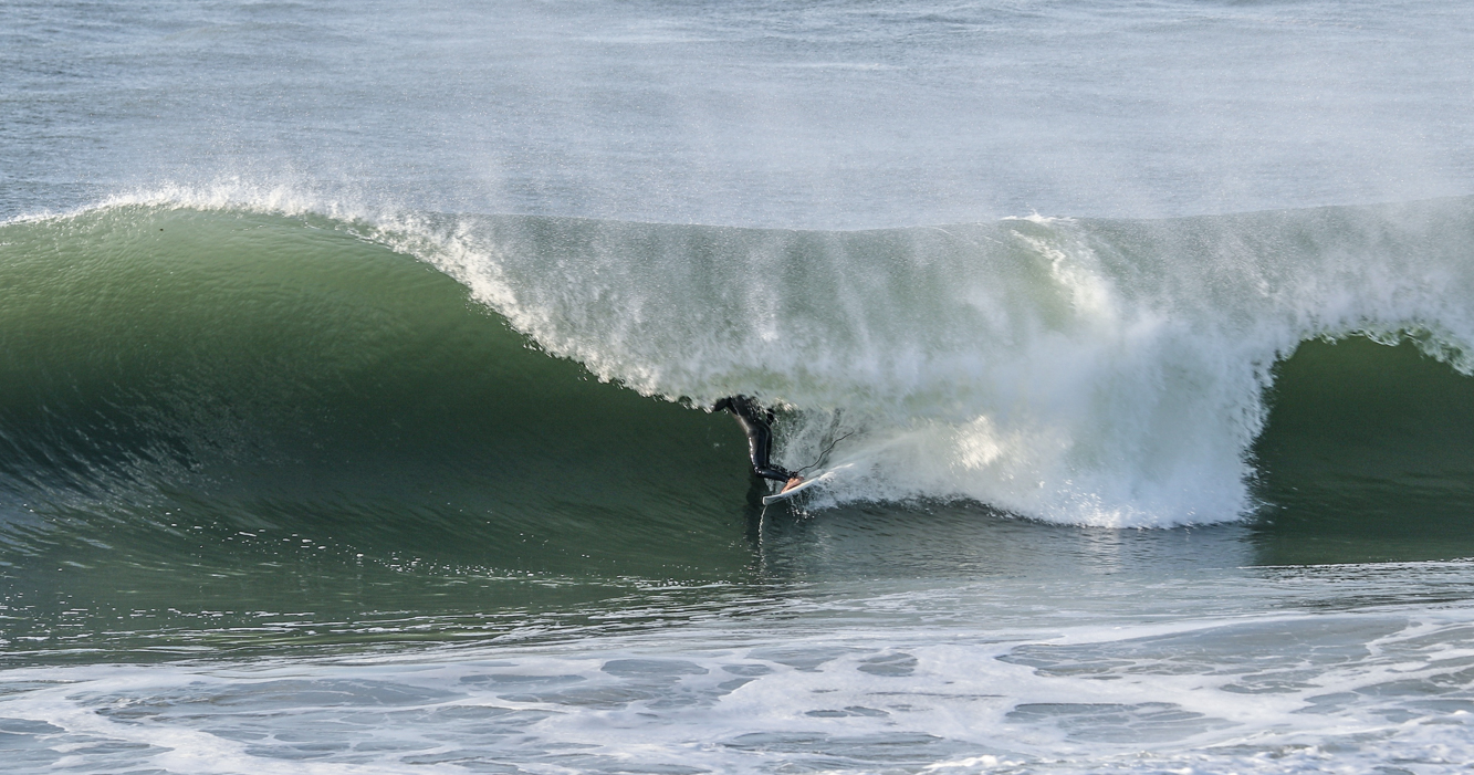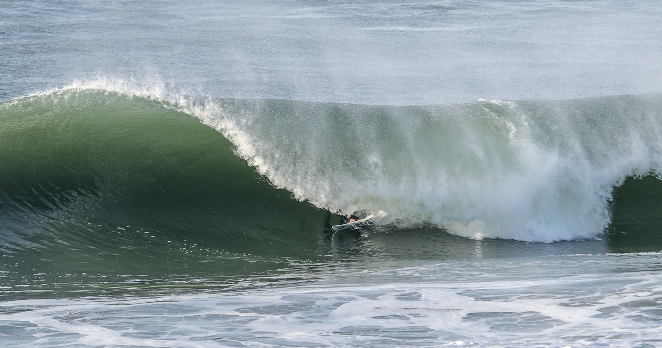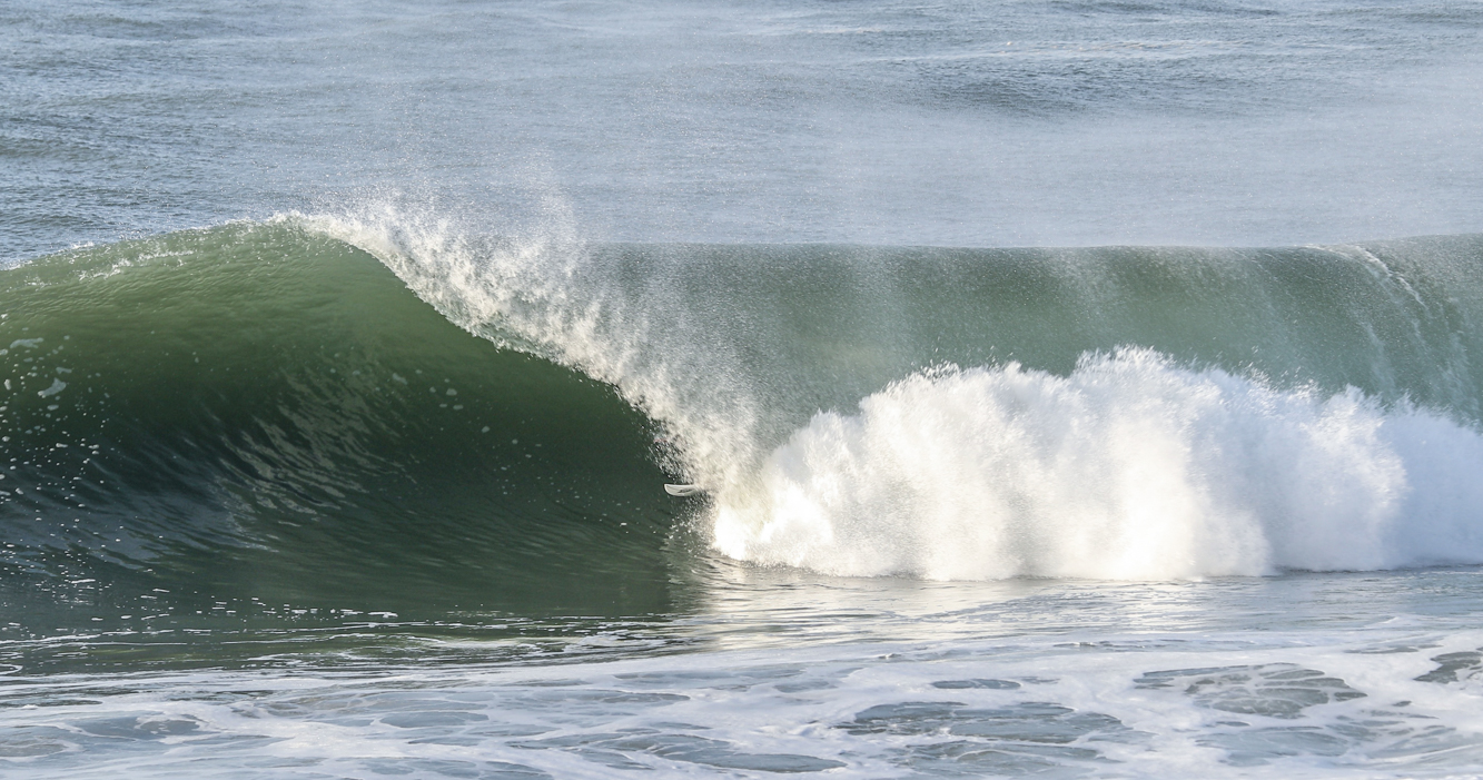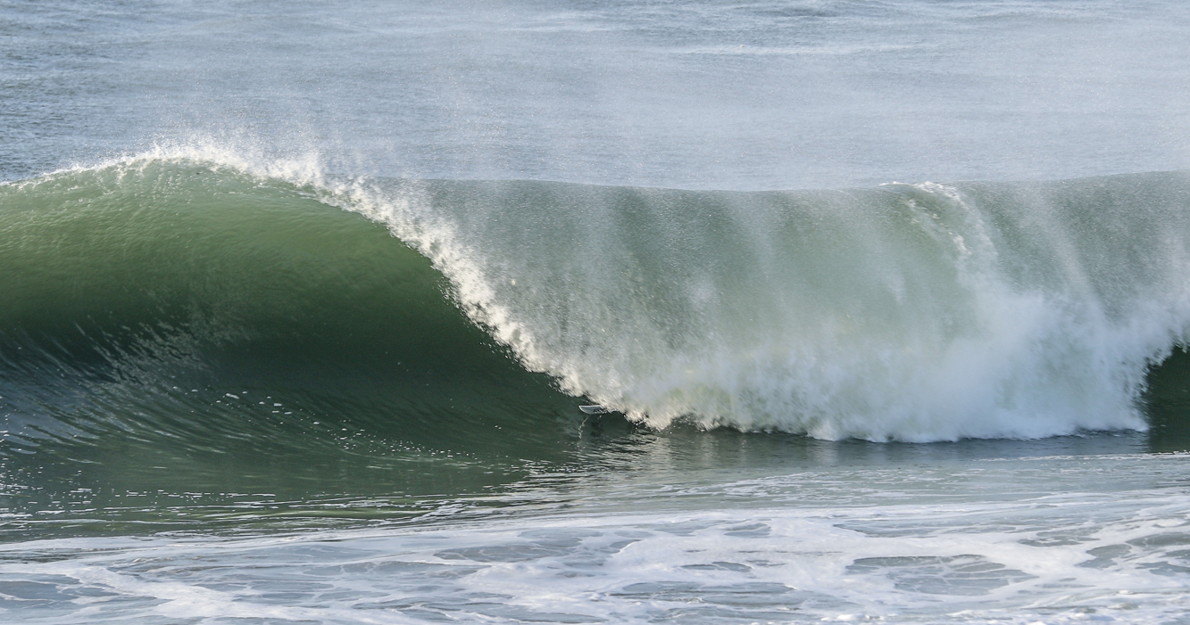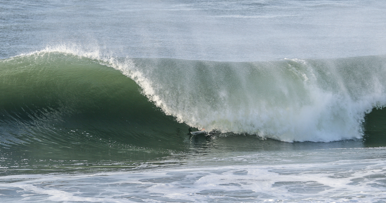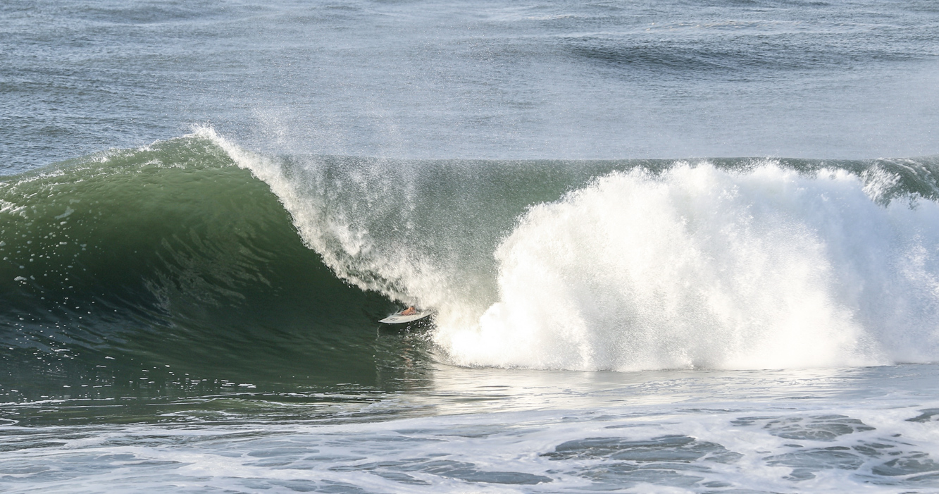 テイクオフした瞬間から波に張り付くも、不規則なバックウォッシュを伴った急激な巻き上げにより一度ボトム側に吐き出されそうになりながらも、まさに紙一重のタイミングでリップをかわしながらチューブの中に身を潜め、まさかのディープチューブからのスピッツアウト。