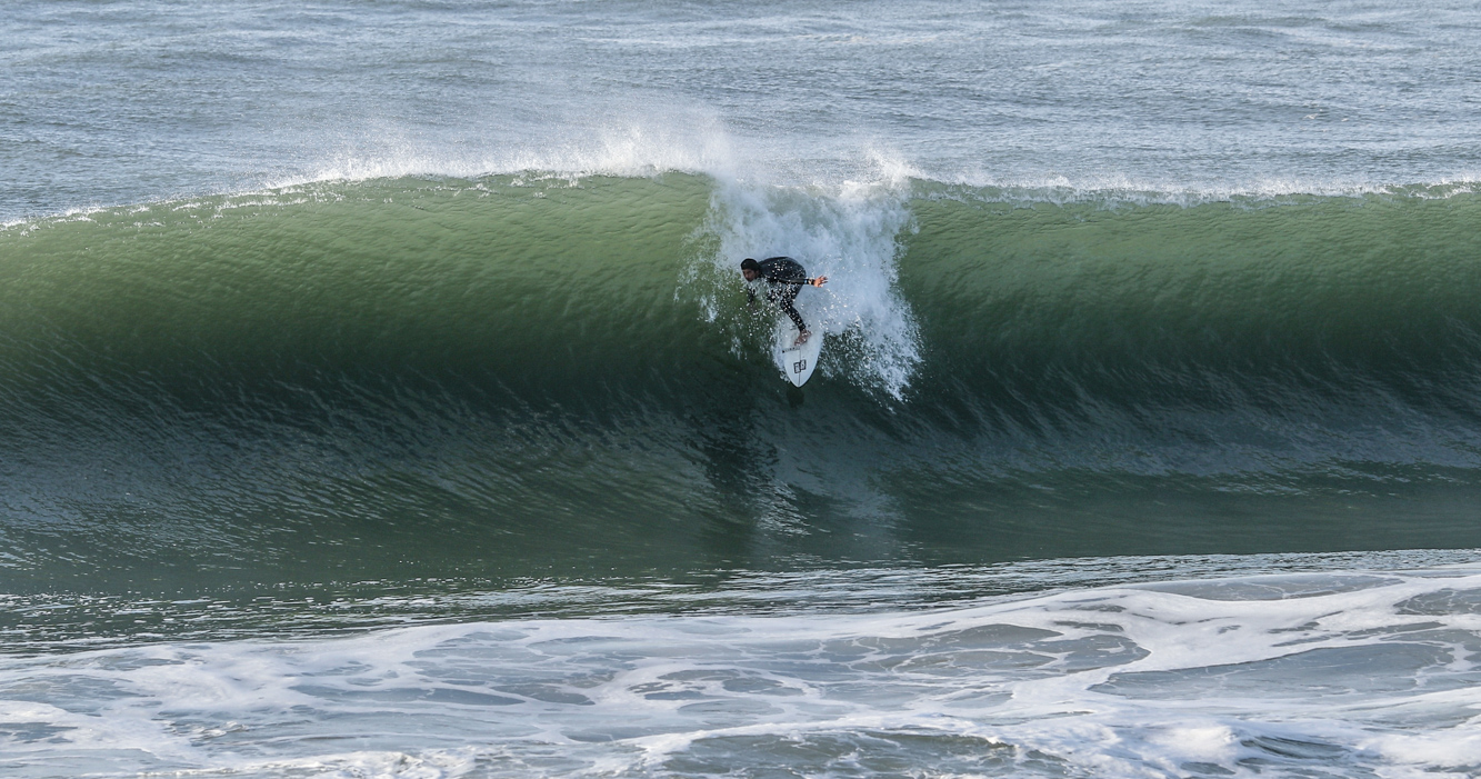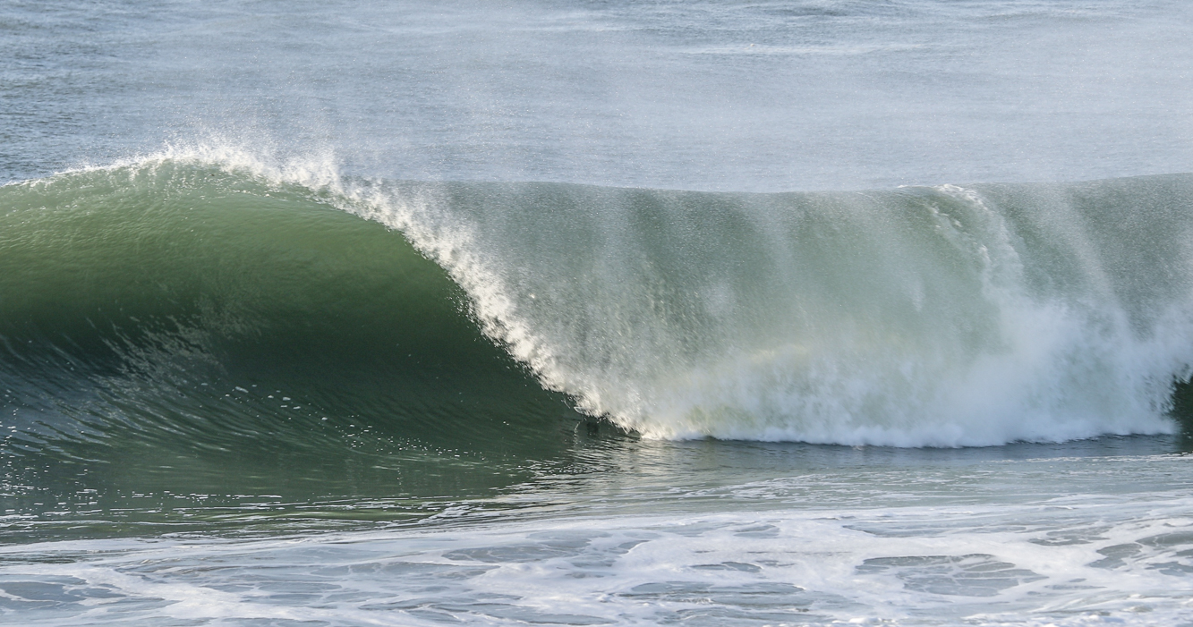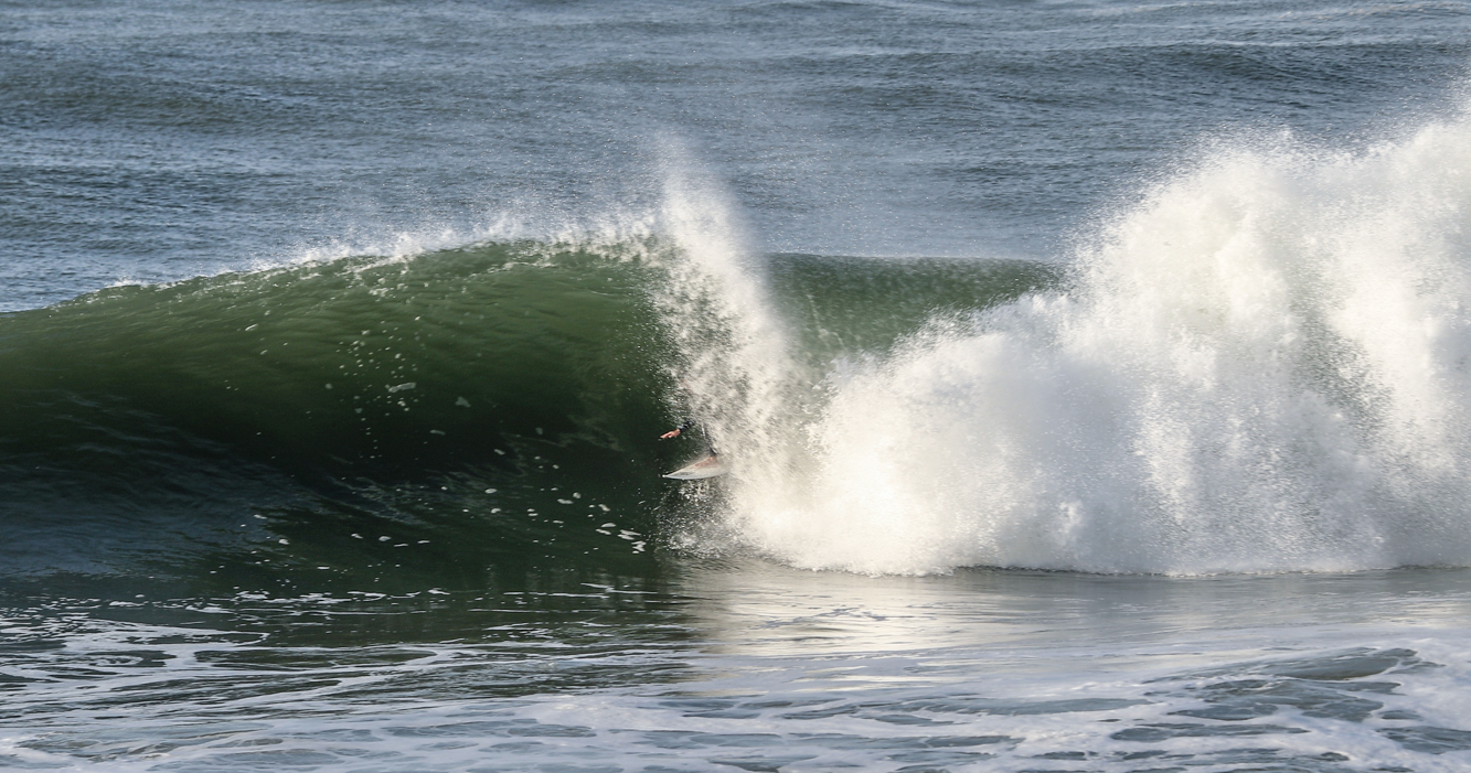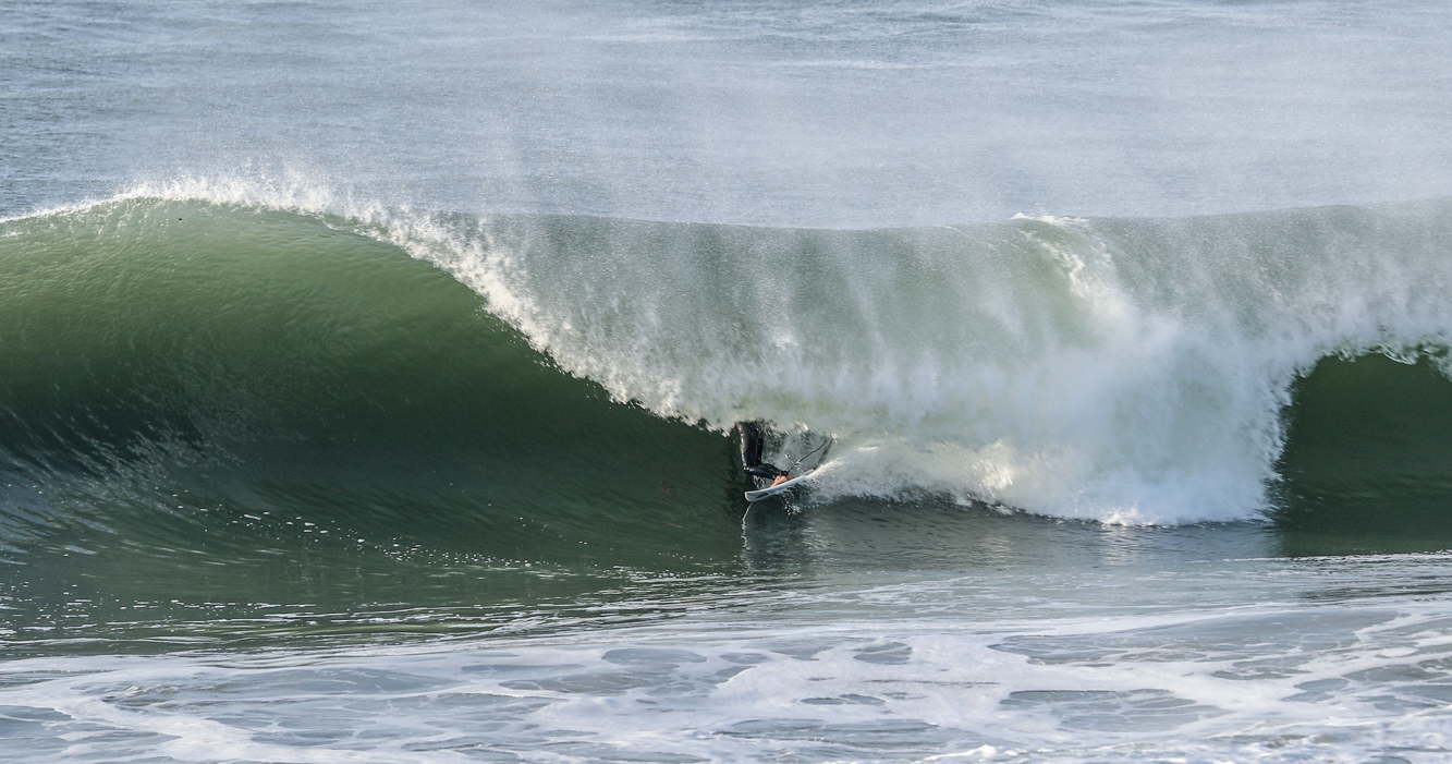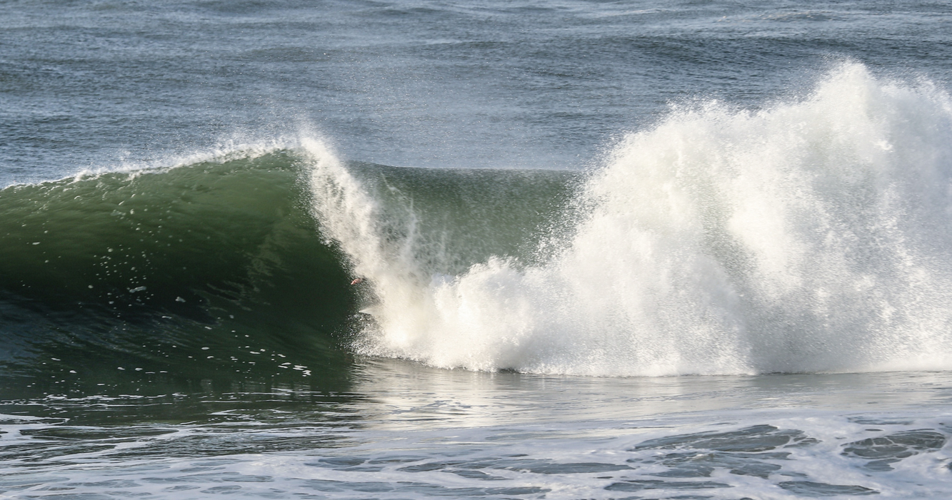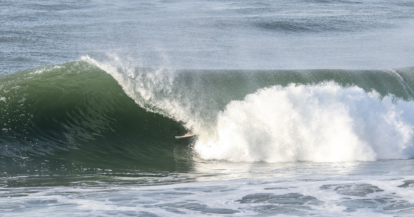 テイクオフした瞬間から波に張り付くも、不規則なバックウォッシュを伴った急激な巻き上げにより一度ボトム側に吐き出されそうになりながらも、まさに紙一重のタイミングでリップをかわしながらチューブの中に身を潜め、まさかのディープチューブからのスピッツアウト。