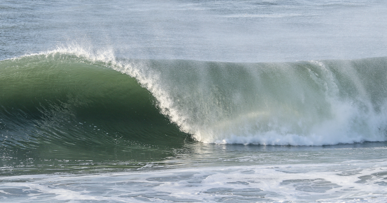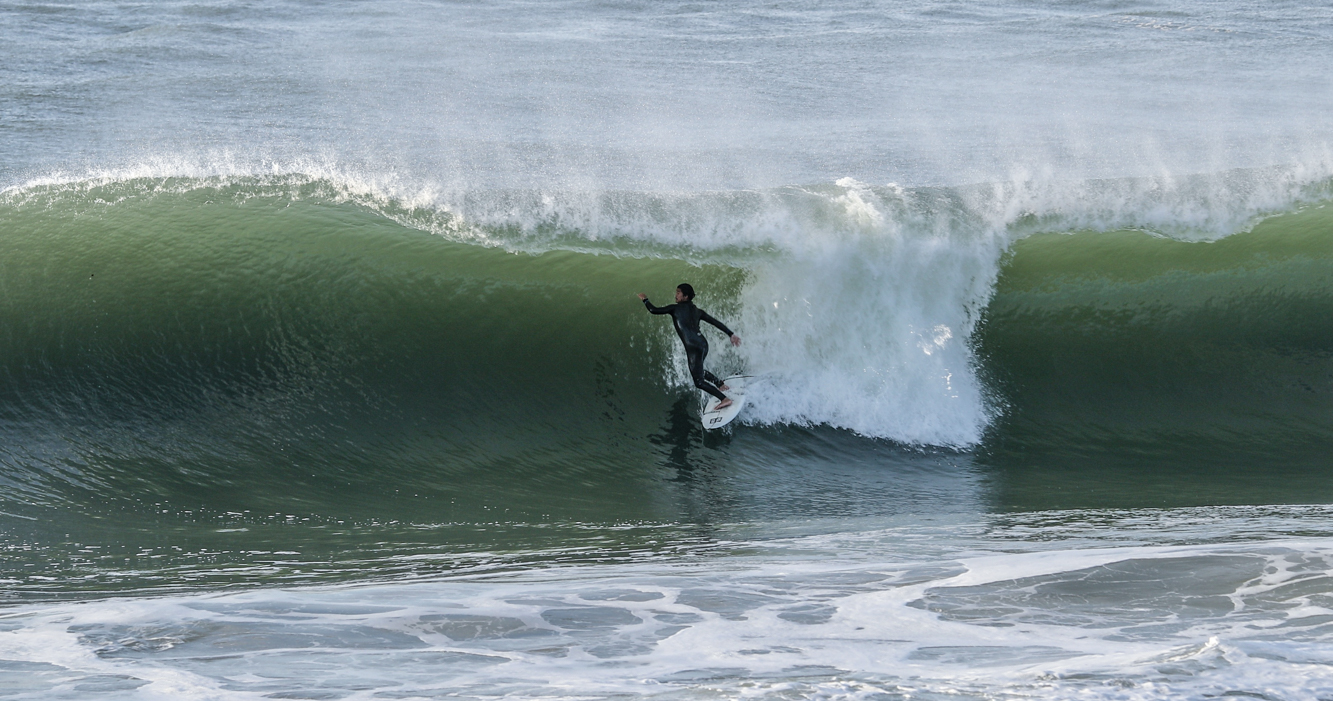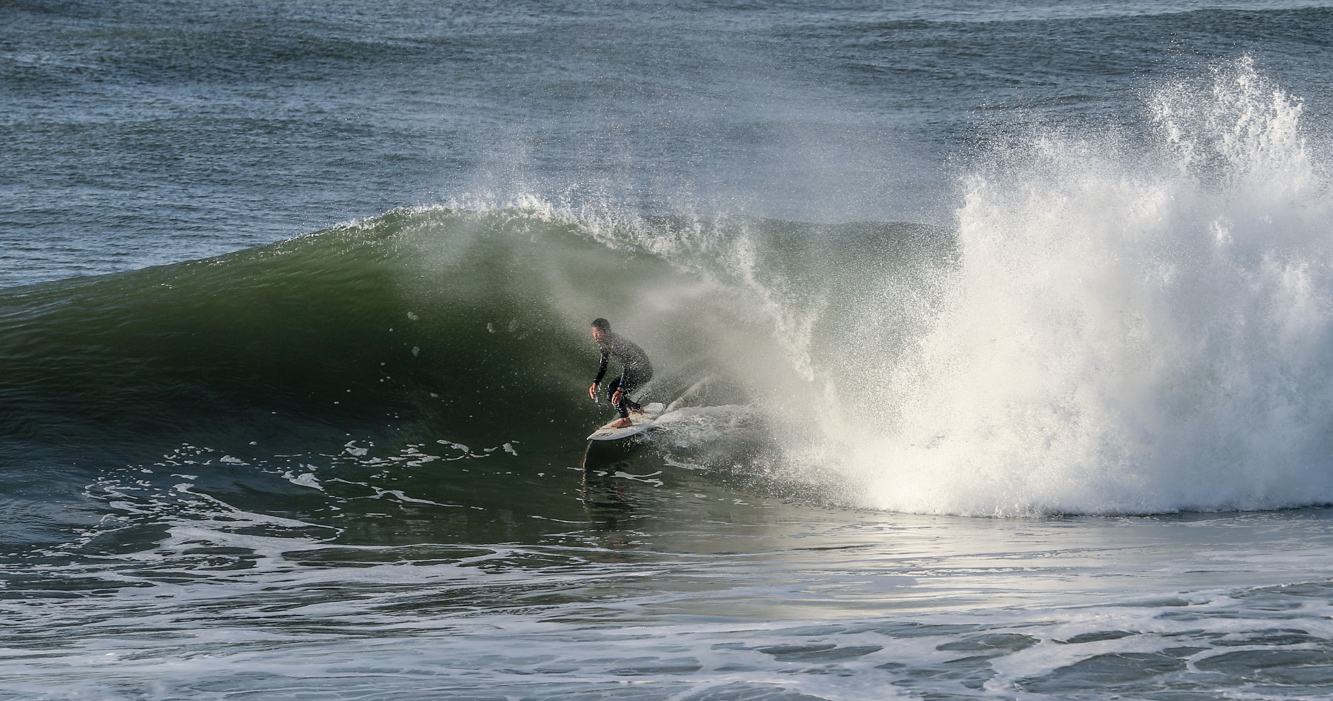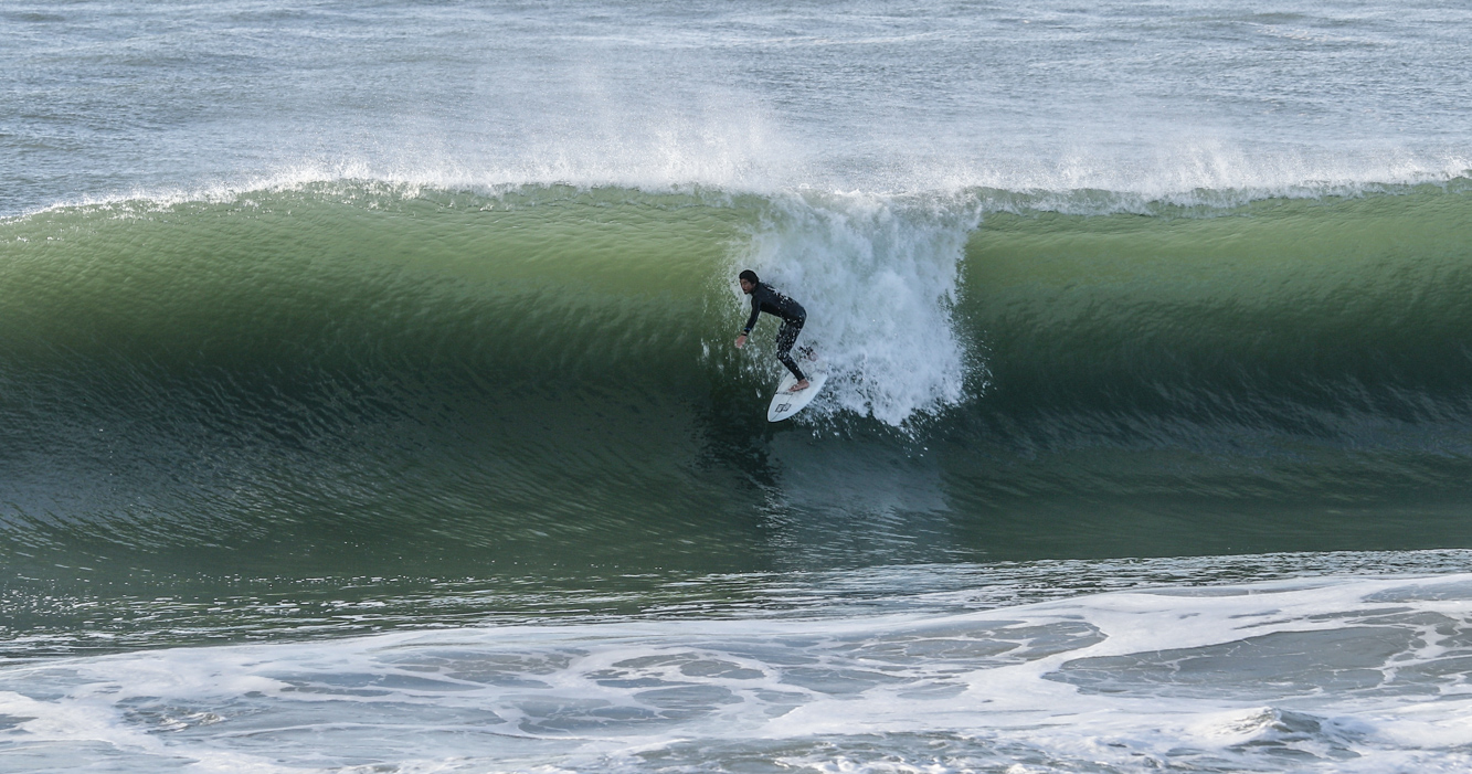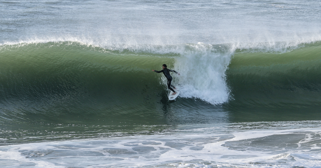 テイクオフした瞬間から波に張り付くも、不規則なバックウォッシュを伴った急激な巻き上げにより一度ボトム側に吐き出されそうになりながらも、まさに紙一重のタイミングでリップをかわしながらチューブの中に身を潜め、まさかのディープチューブからのスピッツアウト。