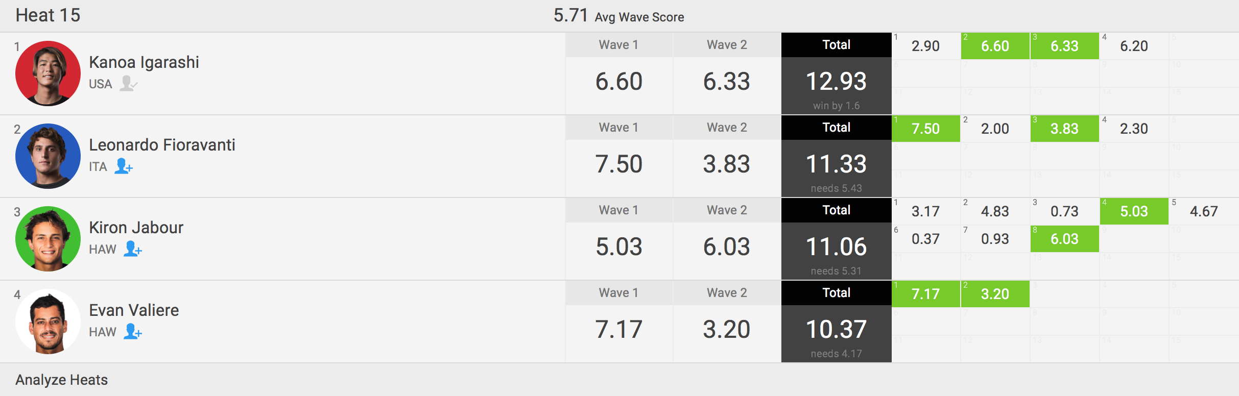 ヒート終了間際にセットが数本入り、各選手が波を掴むも他の選手の追従を許さず、見事カノア五十嵐がラウンドアップを果たした!