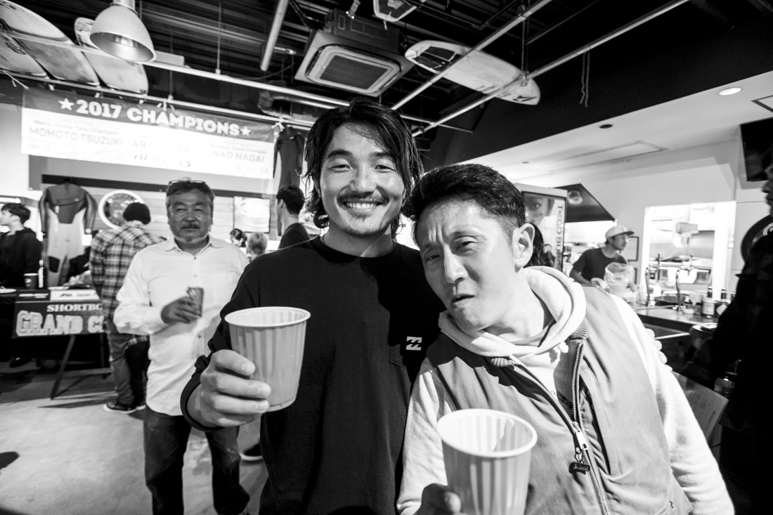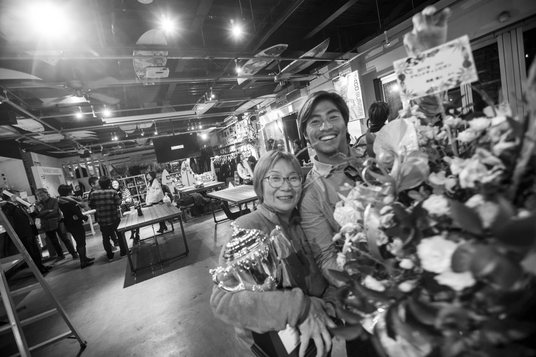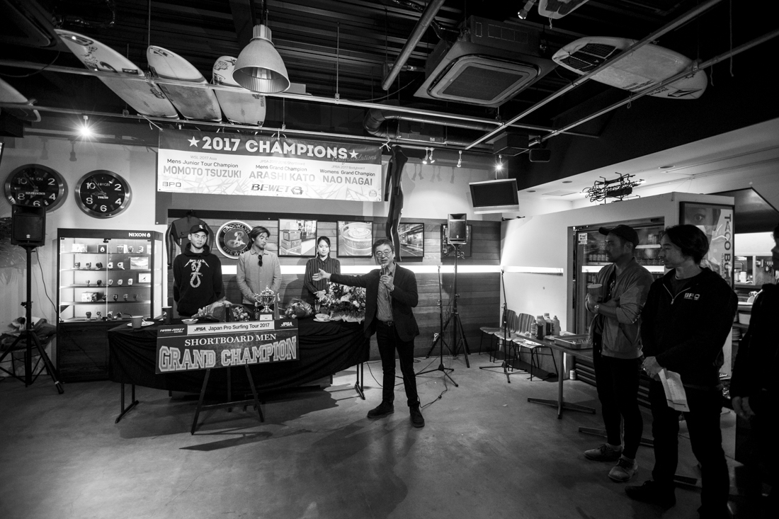 11/29(水)、千葉県一宮町の東浪見にある40miles STATIONを会場に、2年連続でグランドチャンプを獲得した加藤嵐と、2017年WSL asia MENSジュニアツアー・チャンプに輝いた都筑百斗、JPBA WOMENSグランドチャンプに輝いた永井那旺といった3名のBewetチームライダーたちを祝するBewet主催の祝賀会が40miles STATIONを会場に開催された。