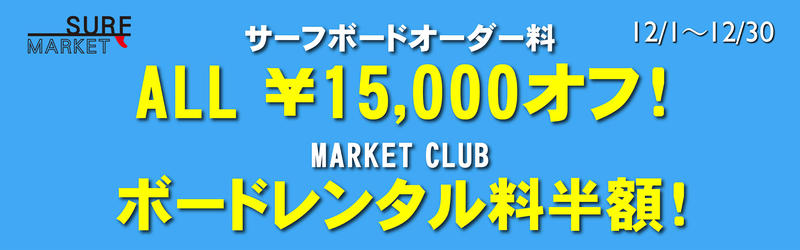 さらに現在、SURF MARKETでは12月30日までの期間限定でサーフボードオーダー料¥15,000オフ、ボードレンタル料半額のキャンペーンを実施中!