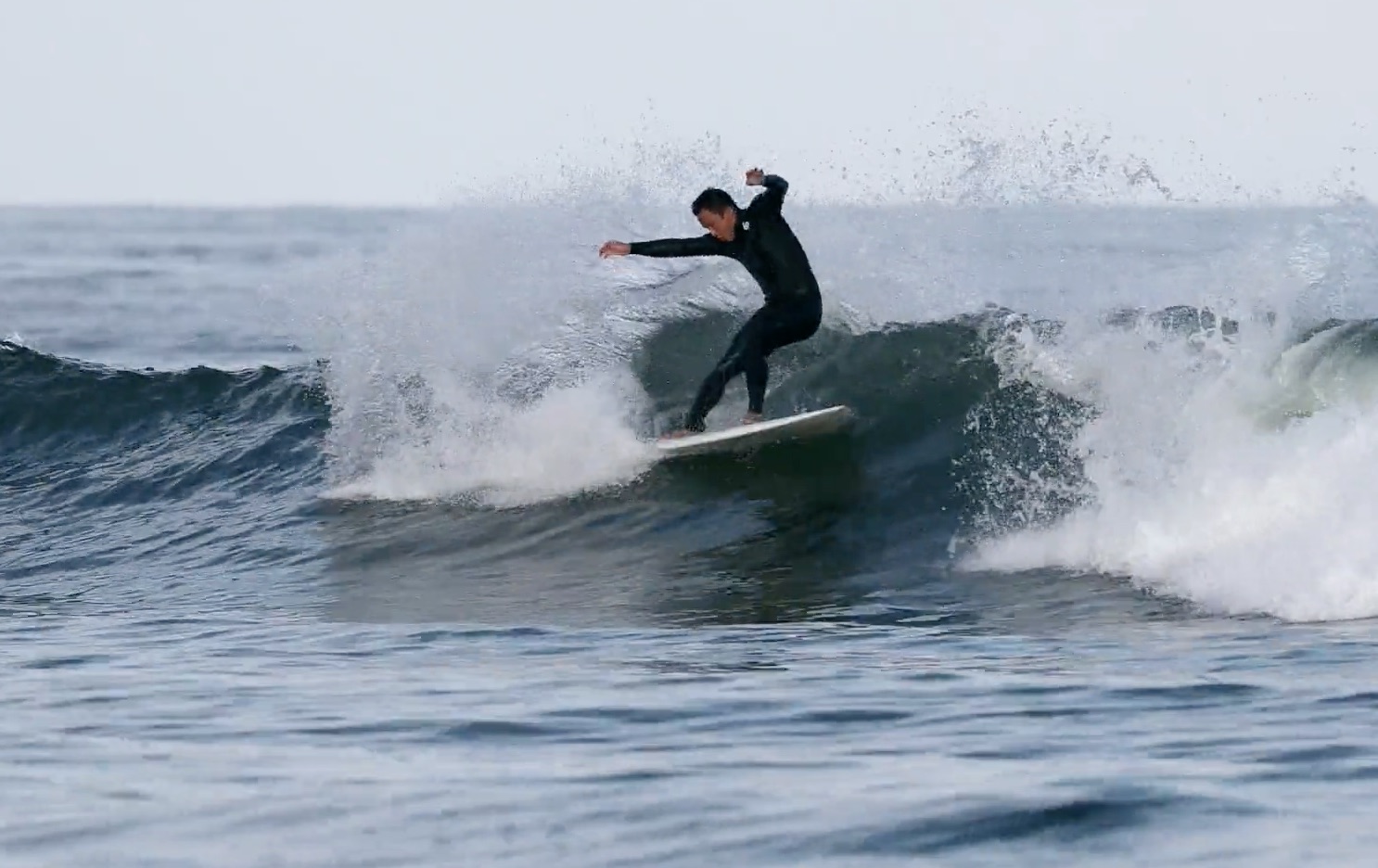 前の方の幅が広くて魚みたいな動きができる板でした。テールでぴゅんぴゅんぴゅんって区切ってあげると細かい動きもできるし、レールでちゃんと走ってあげれば、重軽い走りができるので、すごくいい板だと思いました。もう一回乗ってみたいなと思ったのと、誰がシェイプしたのかすごく気になってます。