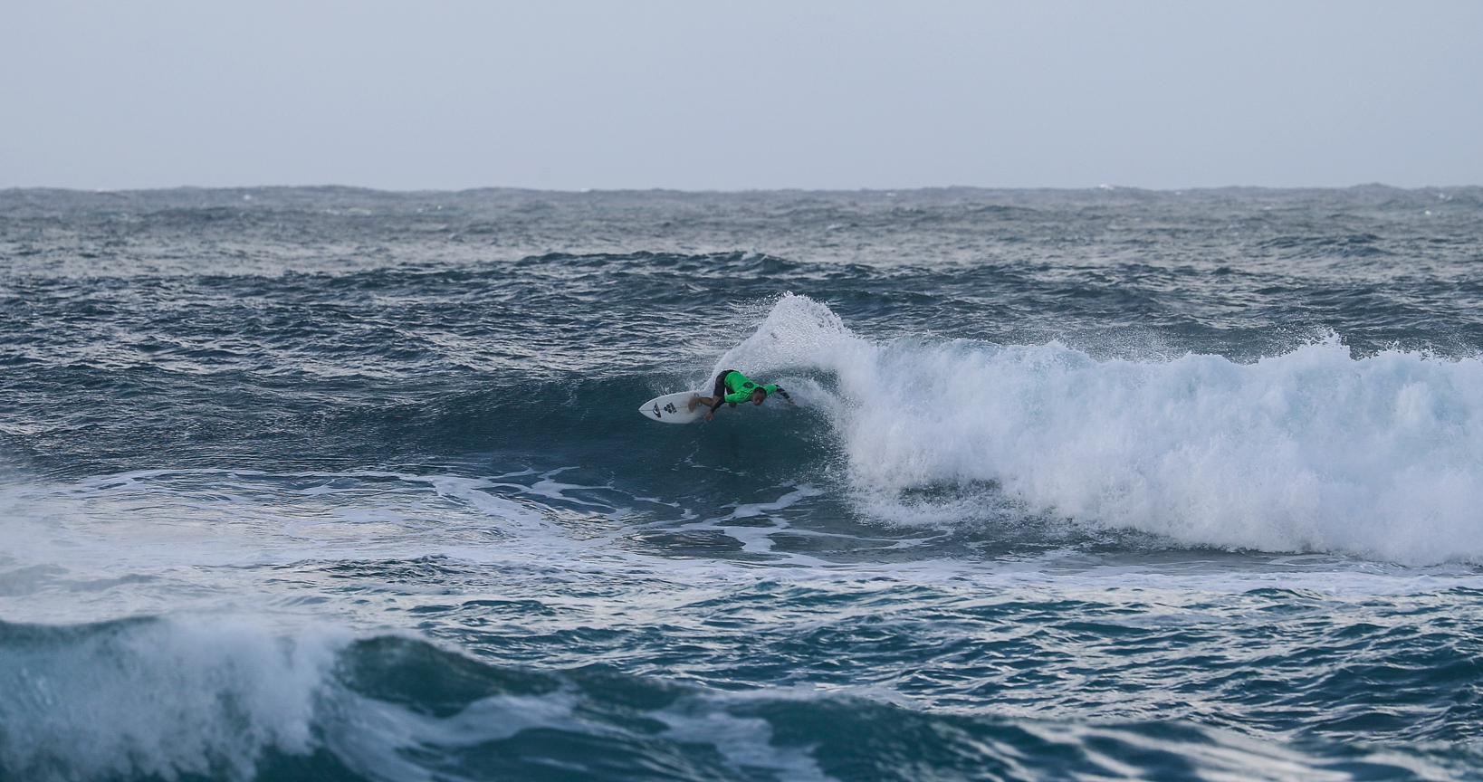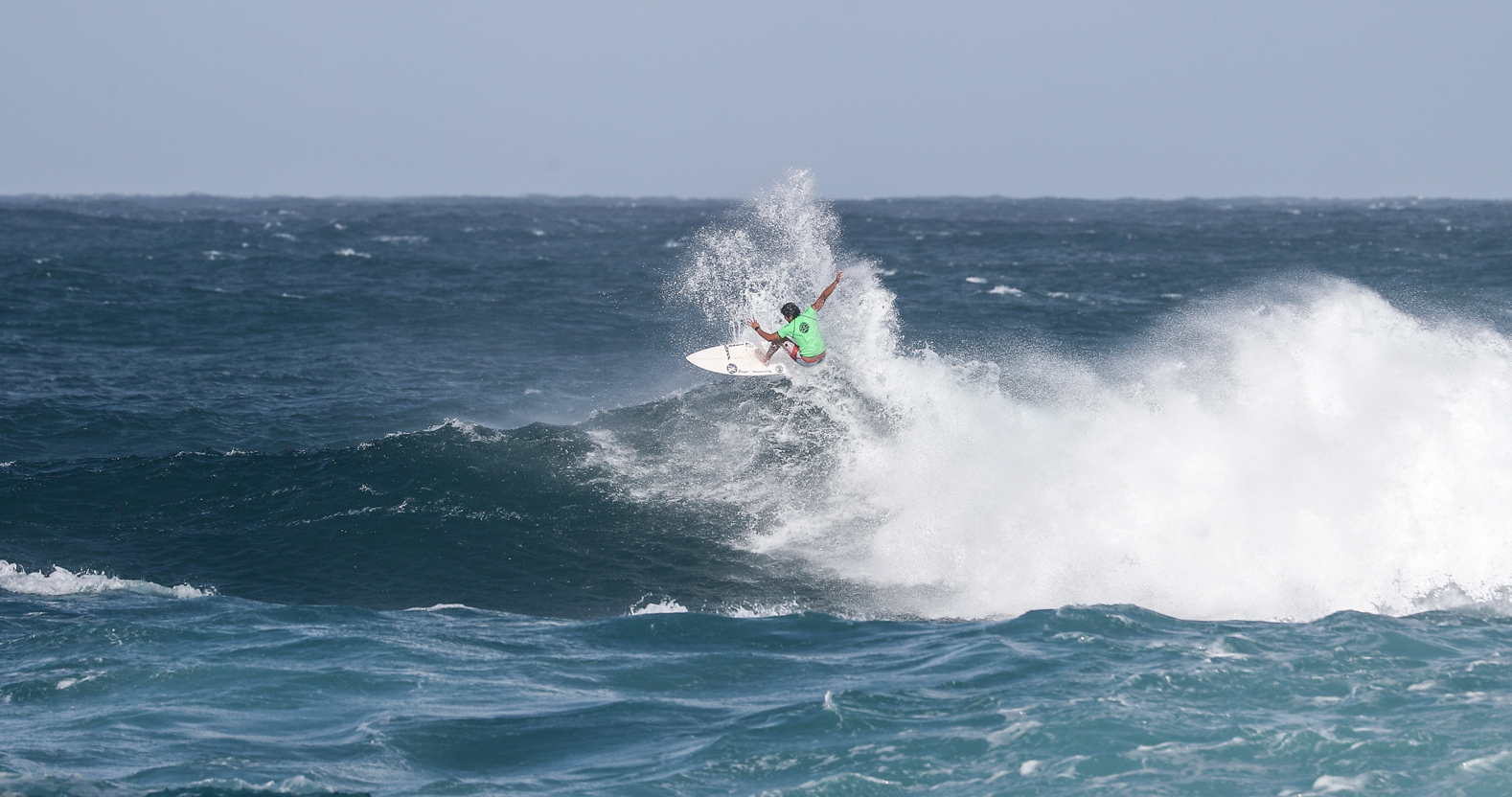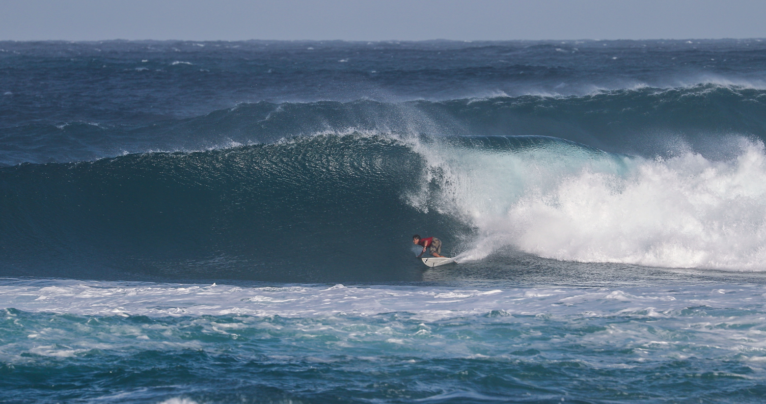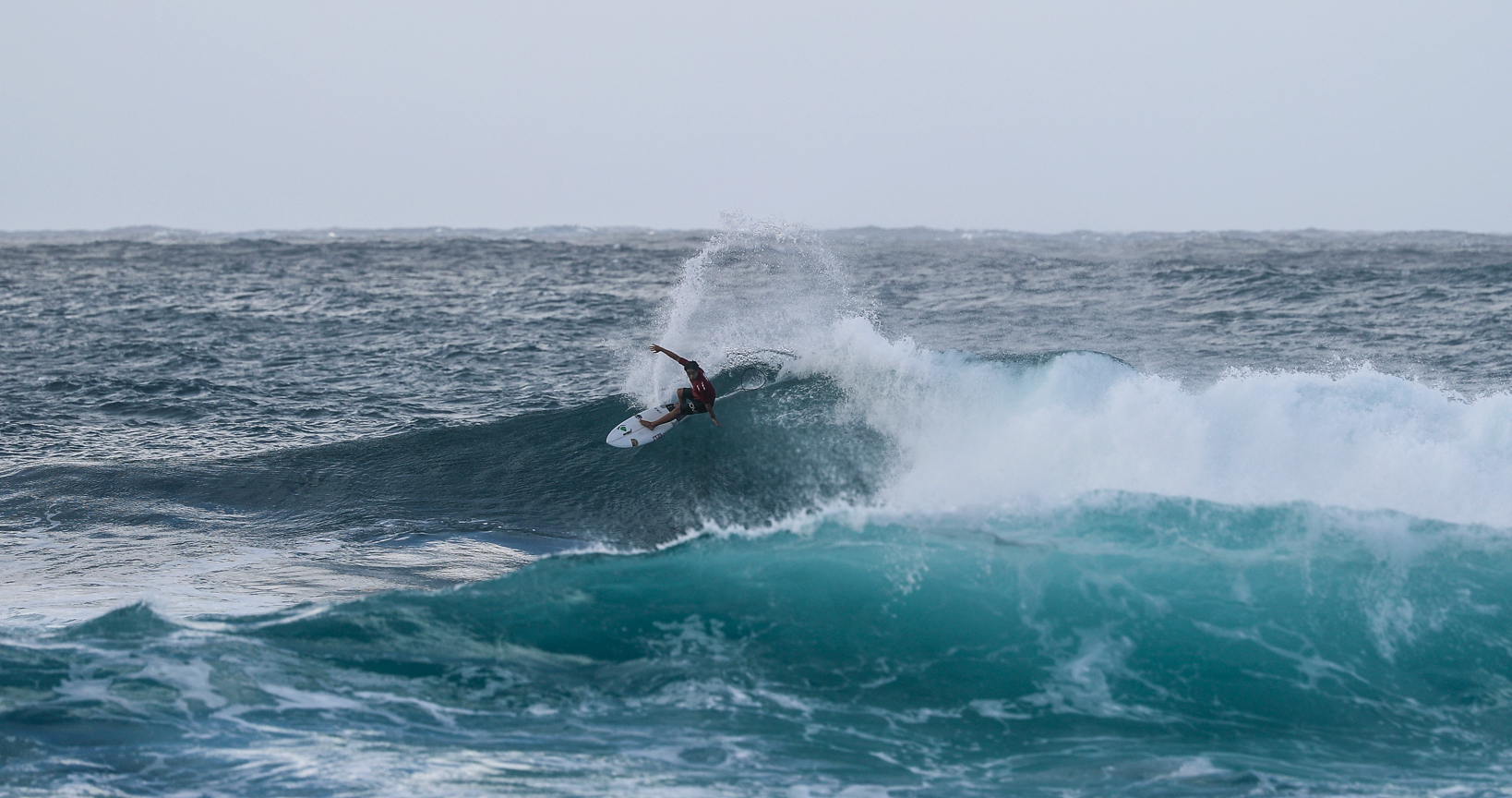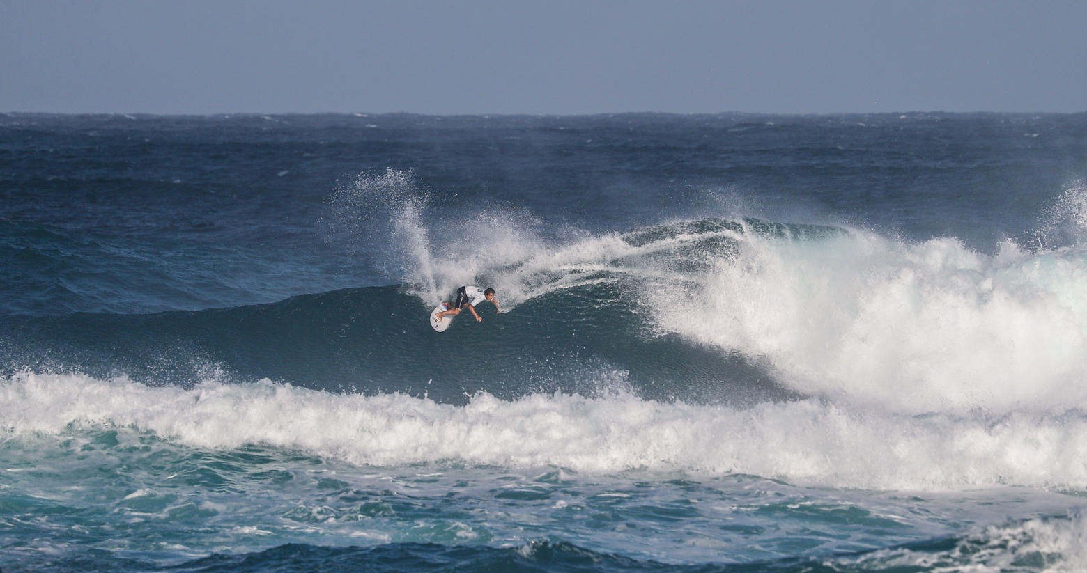 オーバーヘッドからダブル前後のオフショアに恵まれたハワイのサンセットビーチを舞台にQS1000”SUNSET OPEN”のDAY1が行われた。
